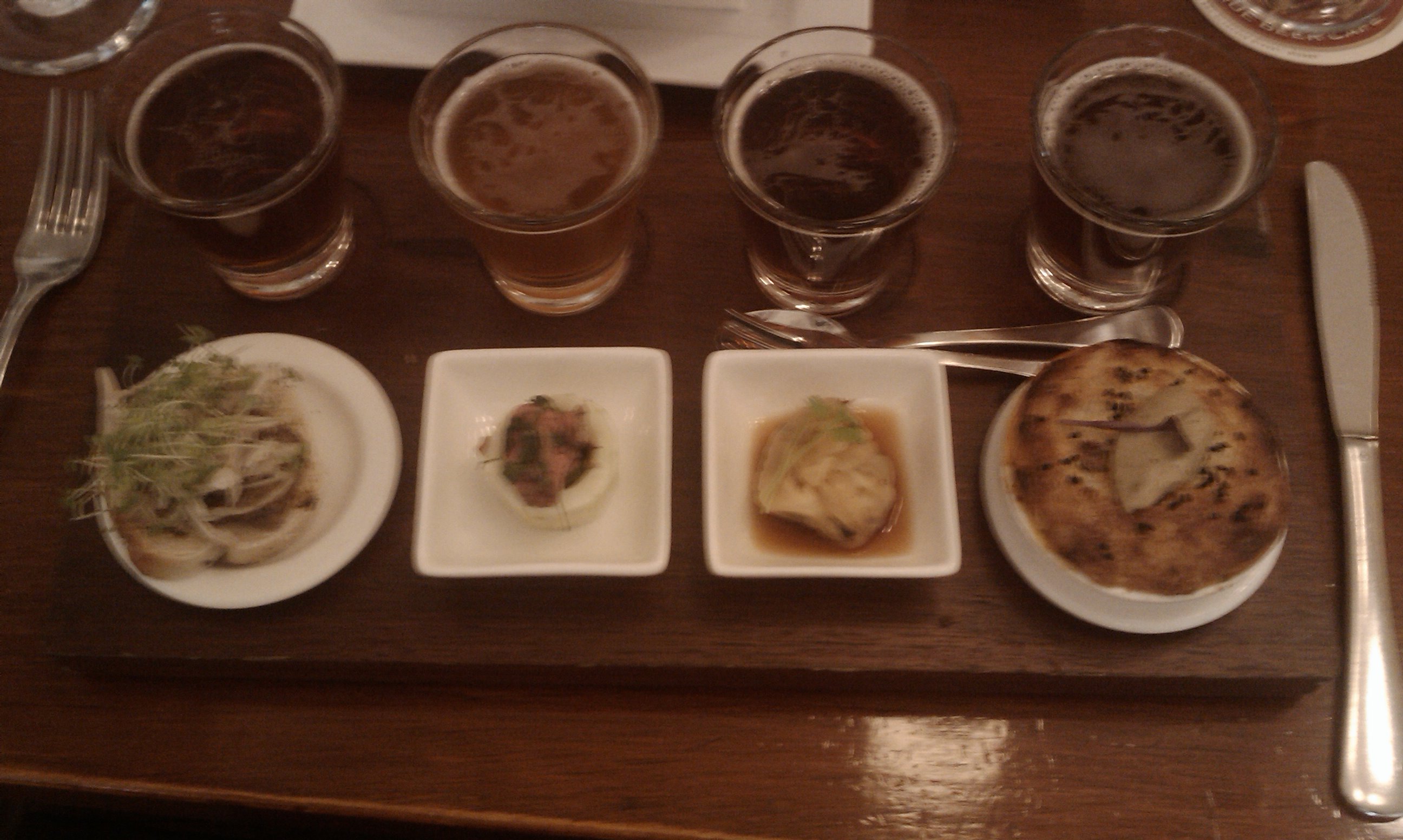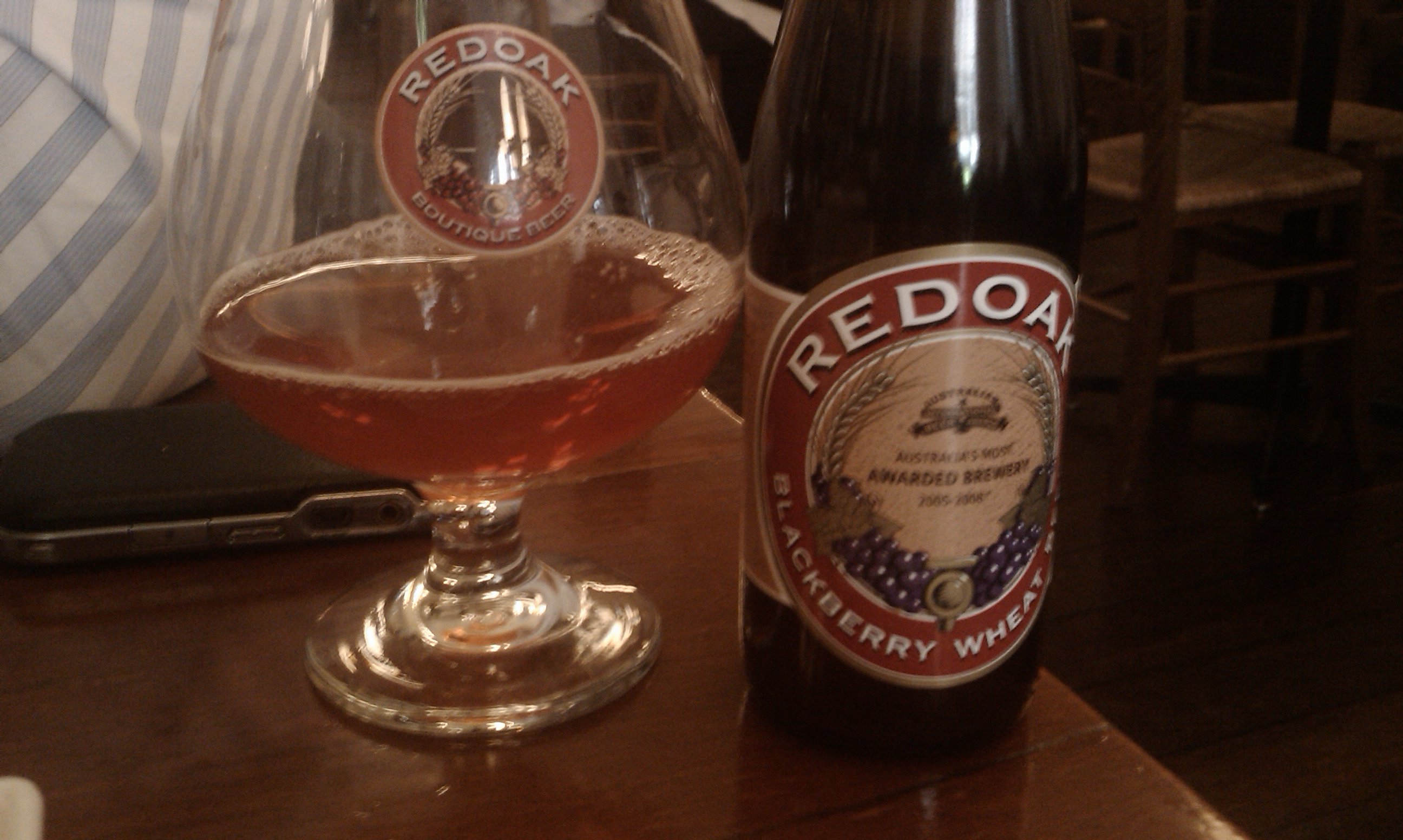 So after enviously reading about Mick drinking beer flavoured with beet sugar, I was immediately drawn to the Blackberry Wheat Beer that was available on the Red Oak menu. This was a mistake, and I think Mick probably had the better beer. I found the Blackberry Wheat beer quite astringent. It was advertised as tart, and that was truthful, but I found it too much so. It has been well regarded in various beer contests – so it might just be a beer that I don’t get. Fortunately the Red Oak has no shortage of other beers to choose from. There’s two versions of Stout on tap, a Kolsch, Pale, IPA etc. They have a 2006 Framboise for $75 bucks a bottle. A review on the bar will go up on the BotF Bar Review Map.