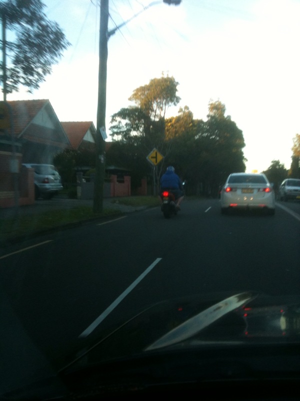 Recently BotF photographed a rather rotund gentleman bravely negotiating McPherson Street on a powerful motor bike whilst wearing shorts and texting.