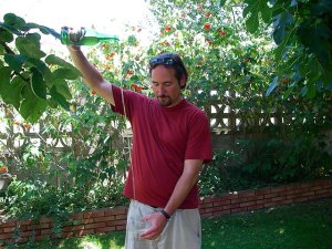 “When Asturian cider is served, it is poured in a particular way, El Escanciado: since it is natural and bottled without gas, the bottle must be held above the head allowing for a long vertical pour (requiring considerable skill and accuracy) which causes the cider to be aerated when it splashes into the glass below. This gives it a pleasant “zingy” taste. The glass is passed around and everyone drinks from the same glass. After drinking most of the glass, it is customary to splash a little out onto the ground, as a way to clean the glass of any lees for the next pouring.”