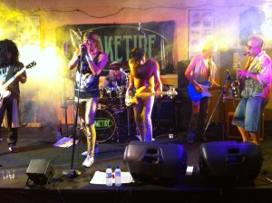The theme of the evening -a fund raiser for the Captain Courageous Bone Marrow Failure Research charity – was 80’s beach party. Your correspondent hasn’t thrown out much of his stuff from that era and it wasn’t a stretch. I’m not sure what beach the Snaketide boys went to in the ’80s – but glam metal was more the look achieved. I don’t think any musician has achieved the look adopted by Tarants, Snaketide’s 6th and best bass-player, but it will stick in my mind for some time. Derek Smalls would have been in awe.