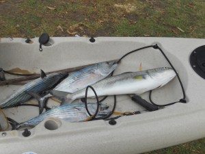 through the reserve to the bay. First problem there was a set of steps down to the beach, so here we go unload the kayak, carry it down on to the beach and then carry down all rest of the gear(paddle, rods, shark shield, net,etc) – hopefully not going to be one of those days. So I paddle out into the harbour, and 1st up spot a massive school of bait fish, surreal going through a soup of small fish. Spotted some surface action ….. paddle across, a few casts and I hook up, after 2 or 3 minutes I can see the bonito way down in the water column, but then damn the hooks pull …….. another pluck at my fly and then a hour chasing the increasingly flighty surface fish. Finally found myself stalking a school of fish smashing bait fish, … hooked up …. the fish takes off, line peeling off my reel, 30 seconds then ping, the line snaps. Eventually manage to get 1 decent bonito before the ever increasing boat traffic – zoo ferries, Mosman ferries, private ferries, jet boats and people hooning around, decided bouncing around was not worth it and retired home. Sirius Cove is not a bad spot I suppose, good for taking the dog for a swim, but it is Mosman and plenty of well to do folk.