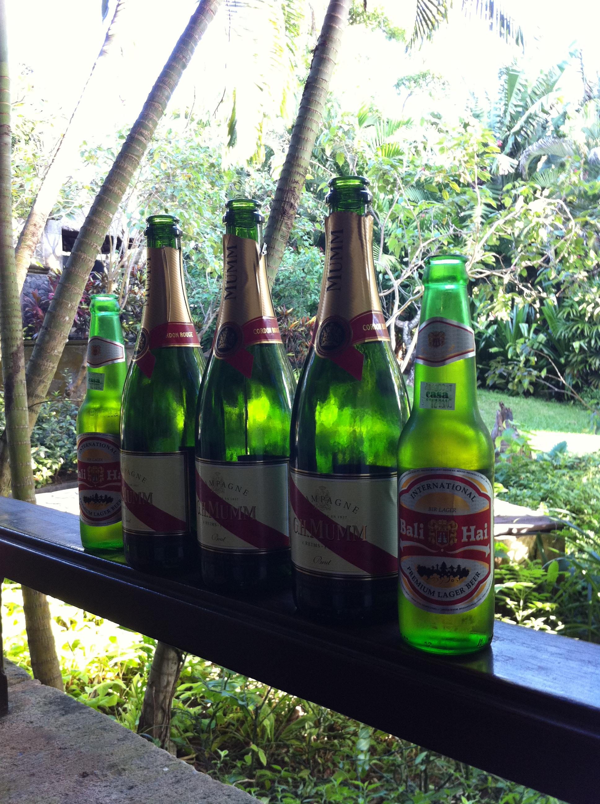 This post comes live from Seminyak Bali. A post code where it’s actually easier to find a Bintan T-shirt than a Bali Hai. Thank god the princess of the tour dragged the two ruffians into a deli (yes – a deli in Bali!) where we were able to source our drink of choice for this afternoon. Sascha ‘let’s just call guest services’ Hunt doesn’t drink beer, but deserves a special mention for insisting we go and aislewalk a Balianese deli. We are contemplating a banana import business given they are going for about 20 cents a kilo even though between the three musketeers a banana lover is no where in sight.