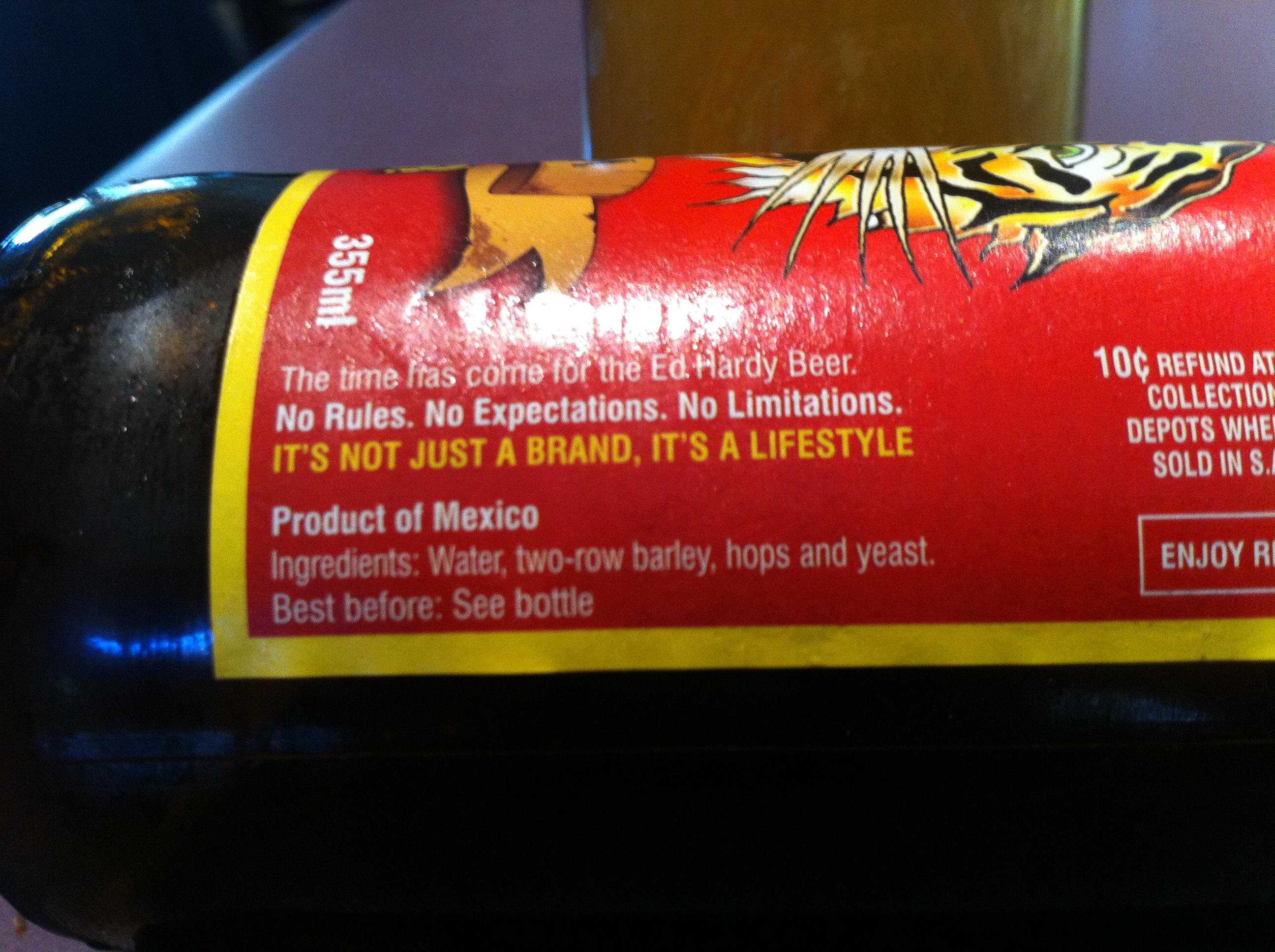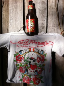 Style triumphs over any substance here, and any beer that offers label hyperbole such as “The time has come for the Ed Hardy Beer” just cannot be taken seriously. I can imagine young trendoids wearing their Von Dutch trucker caps and their Ed Hardy shirts would think that swigging from a stubbie of this would just complete the look – but I’d probably just laugh at them. Ed Hardy is named for a tattoo “Pioneer” named Don Ed Hardy. Christian Audigier licenced his tattops for use on clothing. Hmmm.