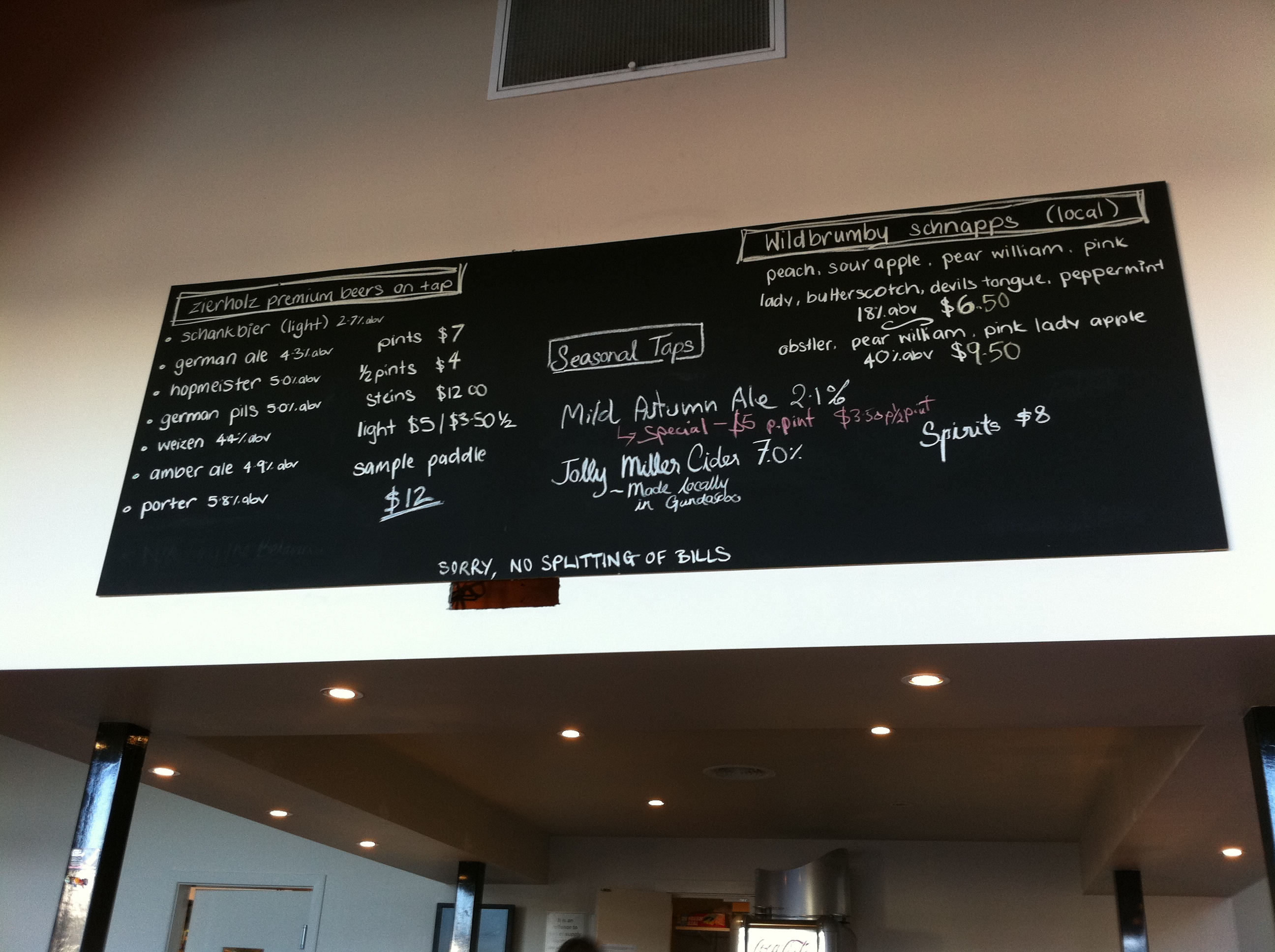 The best way to get into what Zierholz has to offer is to get a reasonably priced rack of 7 beers for $12, and you get to follow that up with a half pint of your favourite. There’s plenty of German style beers – “Schankbier”, “Weizen”, “HopMeister” etc and an Amber Ale in a “Dusseldorf style”. I really enjoyed the German Pils – a wonderful session beer with a sharp hoppy taste. $7 a pint is good value, and there’s also a locally produced cider.