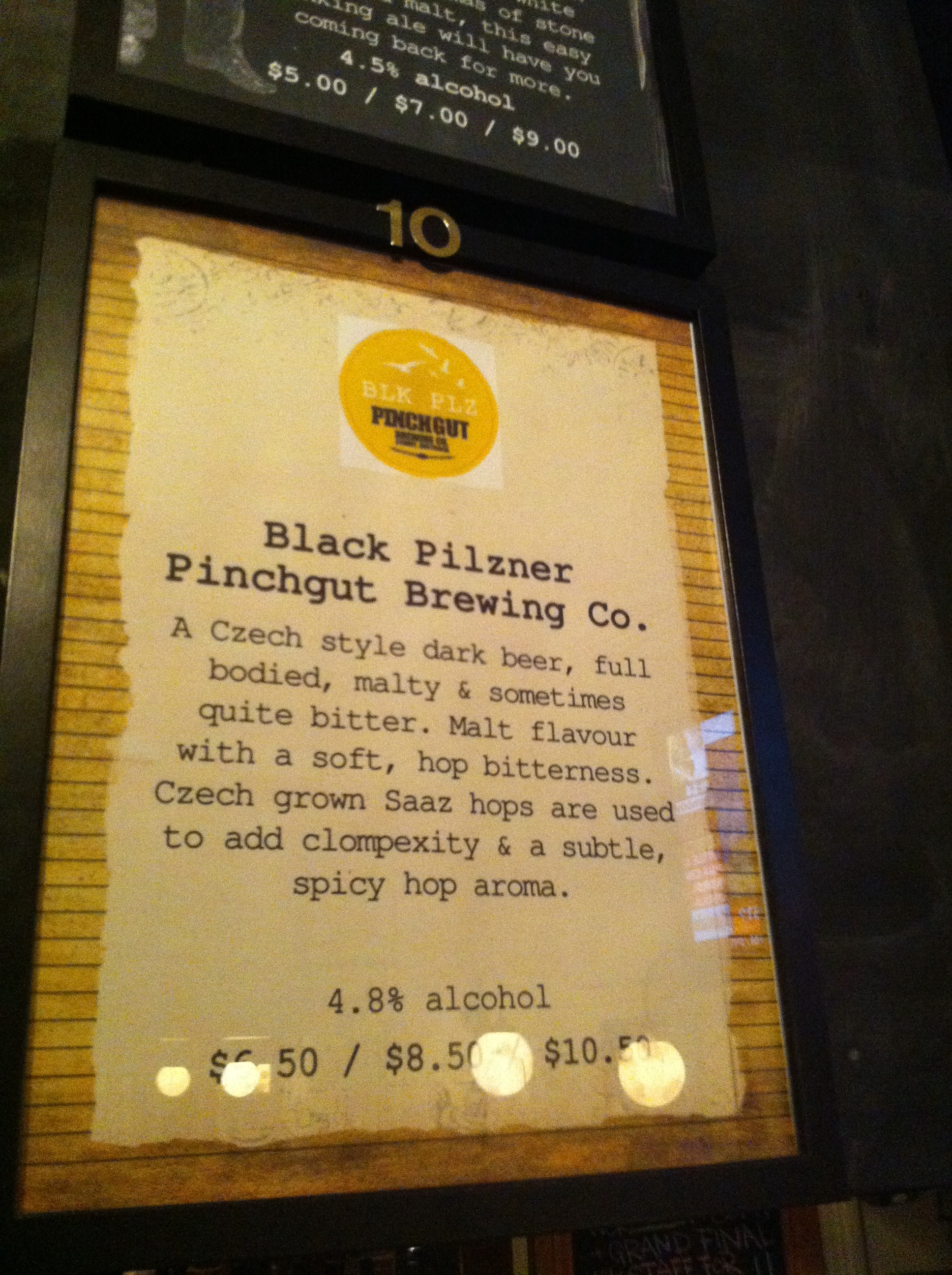 In the past month, two offerings from a new brewery have been available. The new brewery would appear to be very new (website is less than a month old, twitter account is small and single figure Untappd check-ins), but based on what I’ve tasted they deserve to become popular and well-established. I write of Pinchgut Brewing Co, which has been founded by a bloke who has quite a resume brewing for other people, but is now going it alone. Gerard Meares has recently returned from the Czech Republic at the Pilsner Urquell brewery and has clearly been inspired by what goes on there. He really is starting from scratch – pumping out his initial brews and then trying to seek stockists.