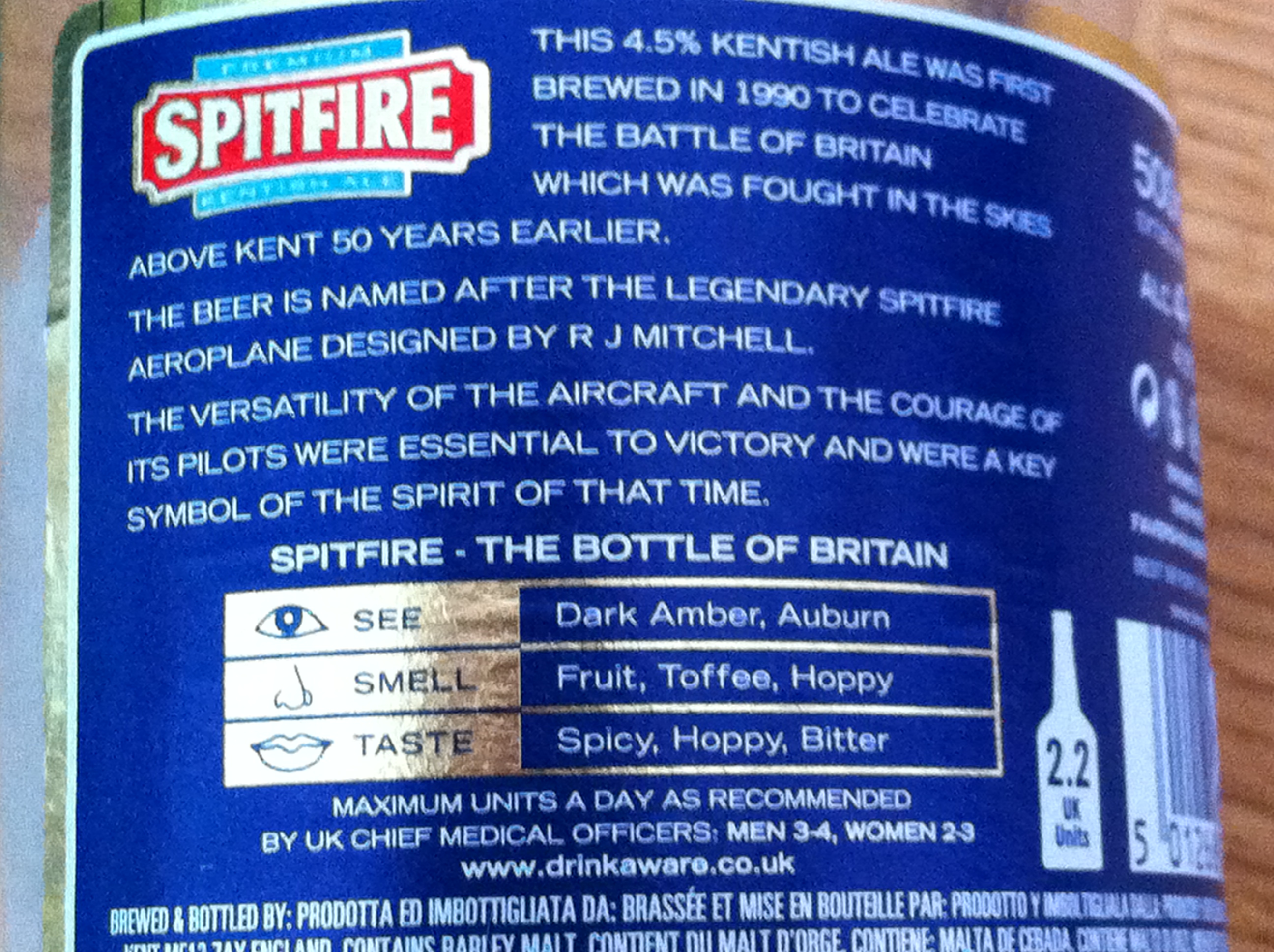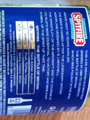Shepherd Neame claims to be Britain’s Oldest Brewer and has probably earned the right to name one of its beers after a very famous symbol of British pride – the Spitfire. This beer was developed in 1990 to celebrate the 50th anniversary of the Battle of Britain, one of the key moments of World War II and a massive turning point about which Briton’s are justifiably proud. I reckon appropriate the name to call Spitfire “The Bottle of Britain” is half weak Boom Tish humour and half faintly disrespectful, but I guess when you donate some of the proceeds to RAF Benevolent Fund and produce such a superb beer you can get away with it. This is a fine beer, lovingly made. From its coppery hue, to its long lasting bitter, yet rich fruity taste – it is simply a pleasure to drink. Very cool bottle and cap.