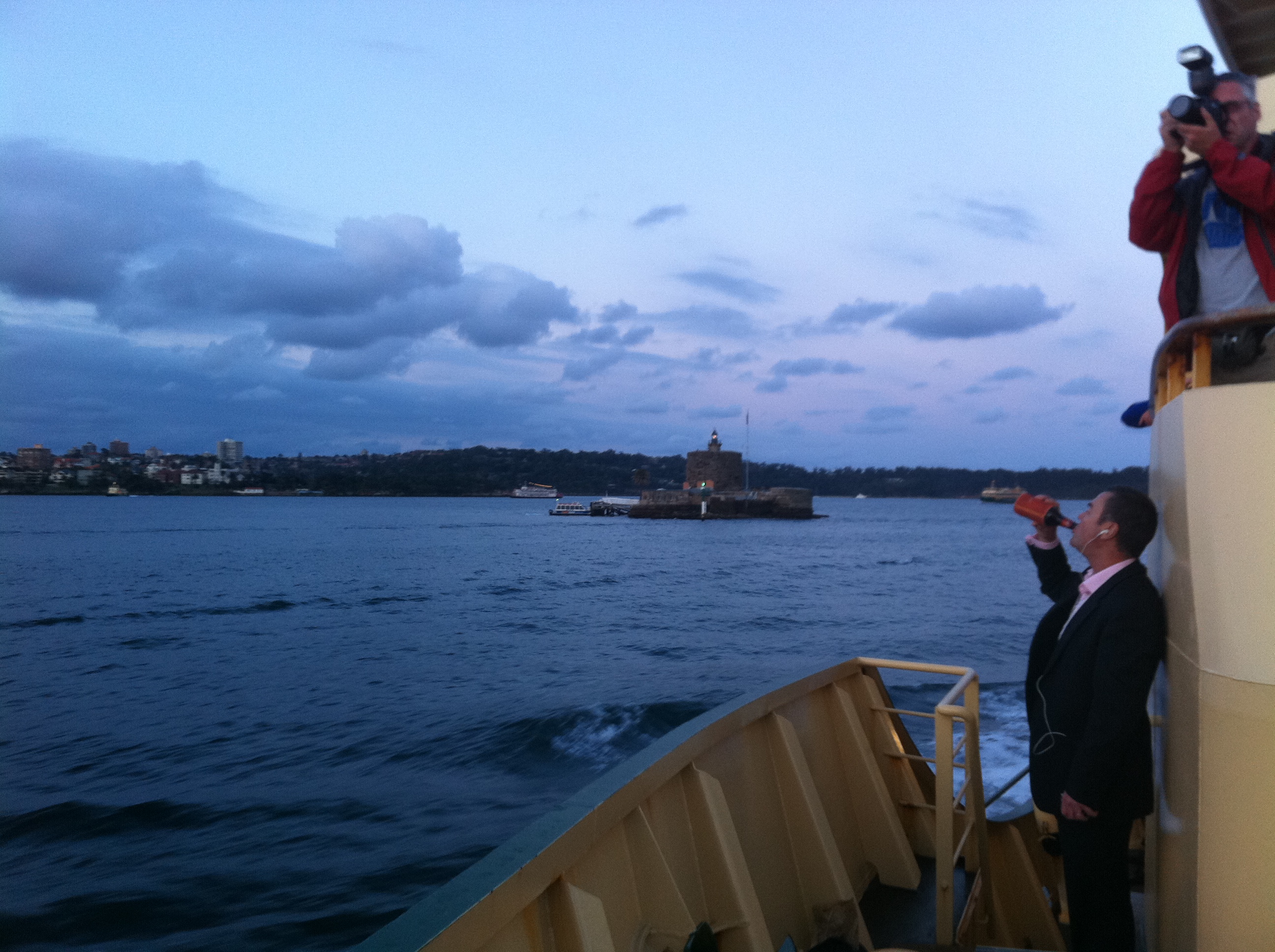 A couple of old faithfuls jagged the early ferry and copped a great view all the way home. An unusual boat snuck up along the northern side of the harbour near Julia Gillard’s soon to be ex-home. We tweeted a photo to see if anyone could identify it. Prof. Pilsner proferred the amusing but probably wrong view via twitter that it was a ferr-ette. You make your own call. I’ve met the learned Prof at a dinner in Melbourne hosted by The Crafty Pint at the Court House hotel. That dinner will be blogged about soon.