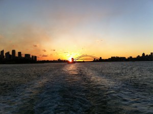 Sydney turned on one of its finest September twilights. The weather was balmy, the sky was speckled with cloud and the ocean was benign as Mother Teresa. The view of the sun setting behind the Sydney Harbour Bridge as we turned the corner at Bradley’s Head was so memorable that pommy_ch has enough to tide him over during his month’s absence.