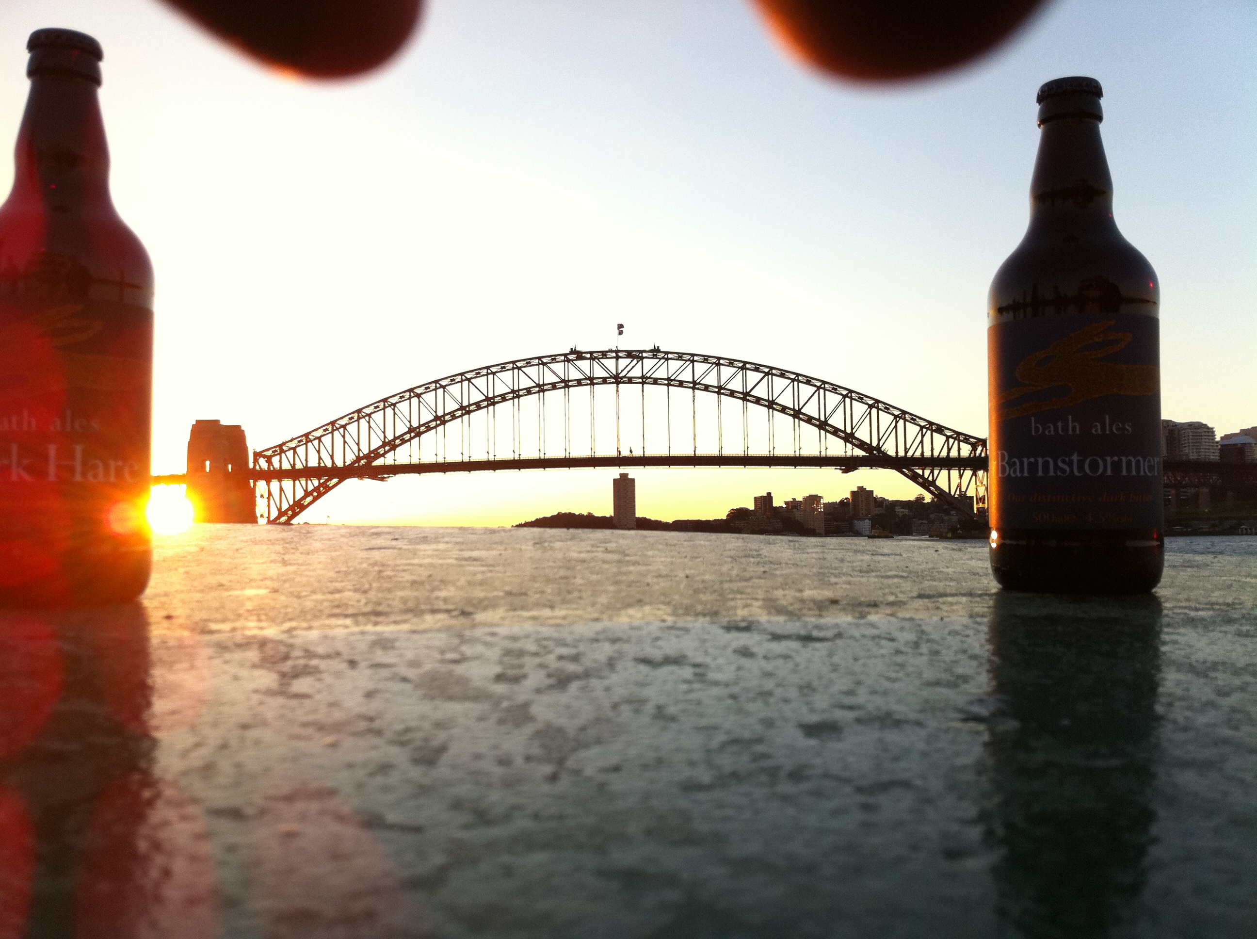 The real treat was what pommy_ch had brought along to commemorate his final voyage for a month. When pommy_ch returned from his last trip he had his bags full of Bath Ales. We’ve already enjoyed Gem and Wild Hare, and they received the full Back of the Ferry Beerporn treatment. Tonight we turned to Bath Ales’ dark side and had were accompanied on our journey by Barnstormer and Dark Hare. To be honest we’ve had better photographic moments, but the Barnstormer still looks pretty good next to the Opera House. We knocked the top off the Barnstormer, but the Dark Hare will be stored in case Sydney has another cold turn. Barnstormer is classed as a “Distinctive Dark Bitter”. Wow – this is a fine beer. Smooth, understated but plenty of flavour. I’m looking forward to having it in a glass, as it colour looks awesome and I’d like to have a sniff of it more as I drink it. Plenty of malt in the flavour and it wasn’t as bitter as the name suggested. A really balanced drop. pommy_ch will get to have plenty of this on tap – and we look forward to the reports. Bon voyage, pommy_ch.