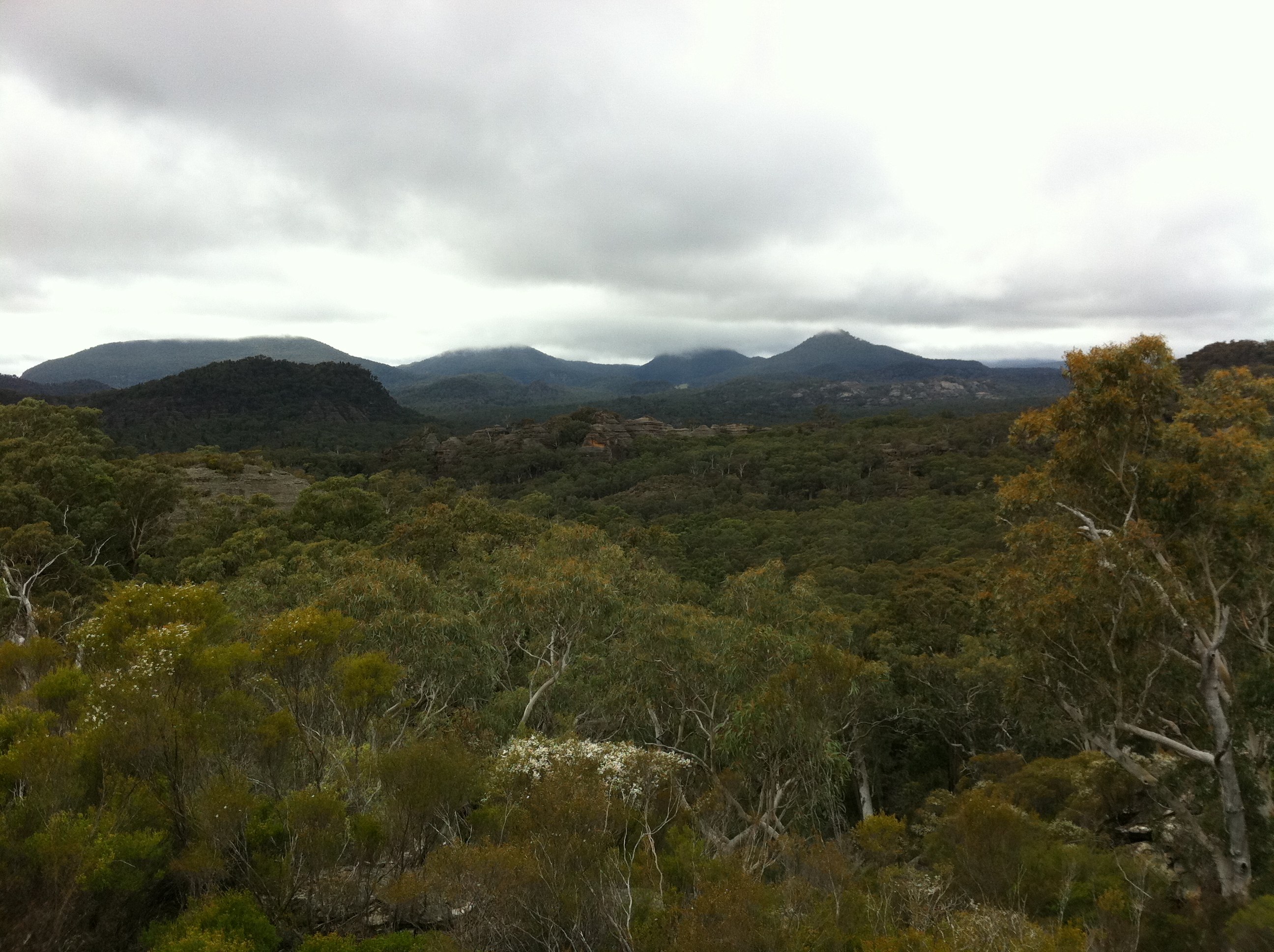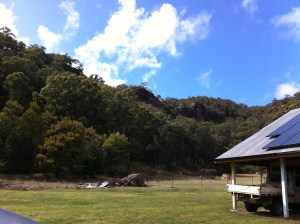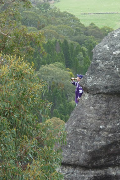 We stayed at a wonderful place called Franks Breakaway Farmstay. Two roomy farmhouses (we stayed in one) are surrounded by 180 degrees of impressive rocky escarpments and sit on a farm of about 600 acres that backs onto the Wollemi National Park near Dunn’s Swamp. As soon as I set eyes on these wonderful stone outcrops from which gum trees seem to sprout, I knew we had to climb them. So two adults and three kids (11, 10 and 7) set out on Sunday morning to get to the top – how we didn’t know. We worked our way up a slope of gumtrees, banksias and
