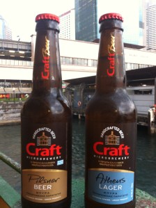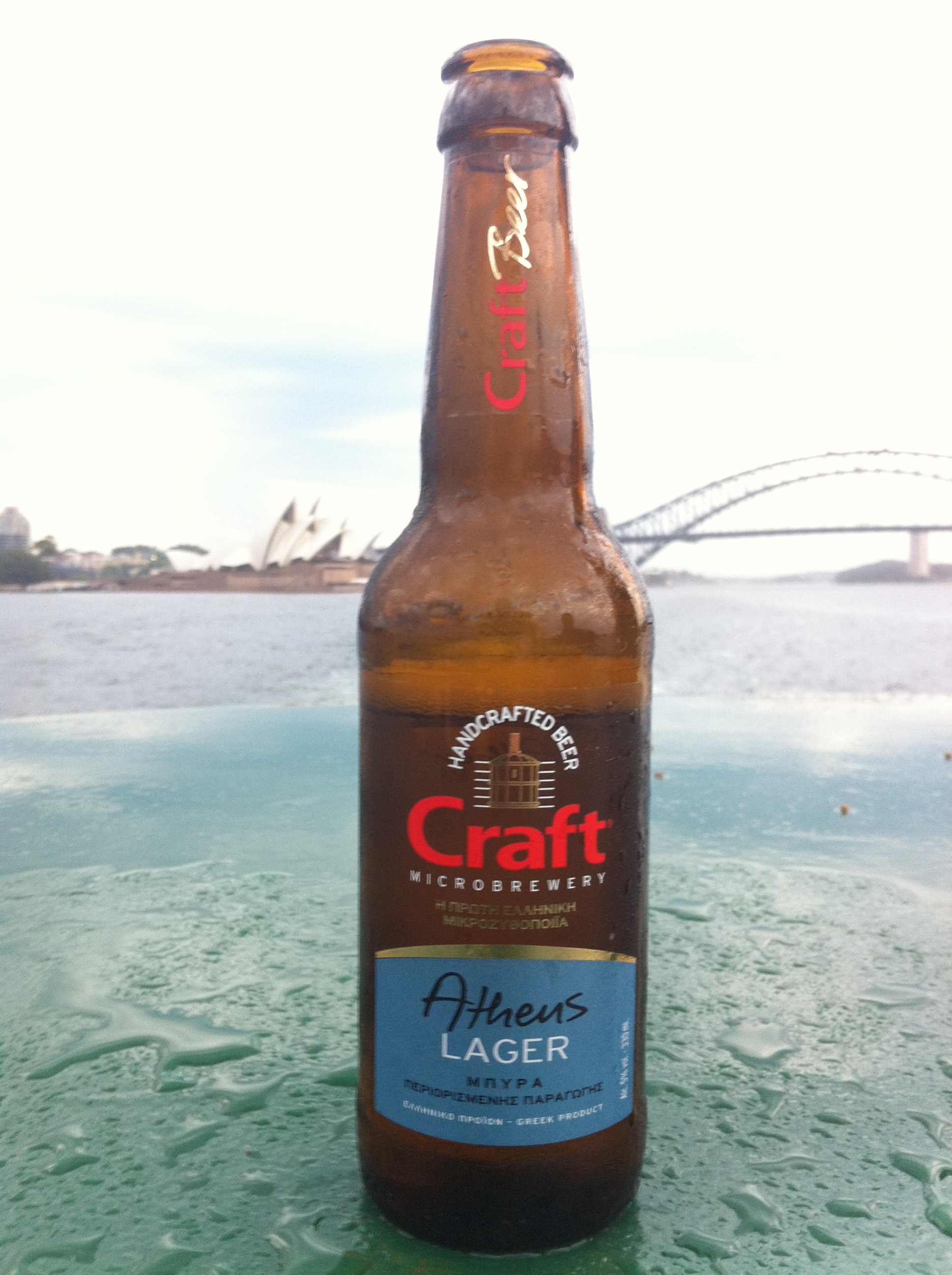 oompalumpa boarded the ferry last week baring gifts. He had been at a lunch at a Greek restaurant and spotted what appeared to be a couple of beers untried by BotF. Craft Microbrewery of Greece makes 6 different beers – a Red Ale, a smoked lager, a black lager, a weiss and the two we tried – Athens Lager and Pilsner. Not only does Craft Microbrewery brew beer, they also run two “Brew Restaurants” one in downtown Athens and the other in the Athens ‘burbs. Every dish is matched to a couple of beers and they also do the ever-increasing-in-popularity take-home growler. They charge 3 euros per litre (I kid you not), which works out at today’s exchange rate at a touch over $4 a litre, regardless of beer types.