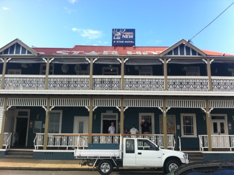 Macksville lies halfway between Sydney and Brisbane on the banks of the Nambucca River. It is named after Andrew Mackay, who helped found the place and who was also responsible for building the very impressive hotel we stayed in. The Star Hotel is one of the great pubs of NSW. Originally built in 1885, it has been wonderfully restored and offers great food, veranda drinking, views of the mighty Nambucca, punting facilities and accomodation. It’s all wood with wrought iron lace.