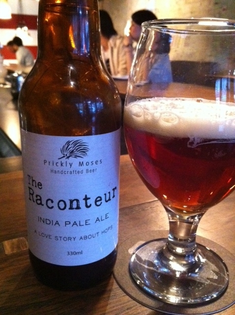 Next it was a Red Duck Amber Ale by Red Duck Beer. All my untappd check-in has is ‘ahhh’ so I think I enjoyed it. The Red Duck tasting rooms look like a must visit destination in Camperdown in Victoria. The next beer was from the menu and in the bottle. The label on The Raconteur by Prickly Moses states the beer is a “A love story about hops”. And it was. Beautiful amber colour that delivered those hoppy post-beer burps I am most fond of. |