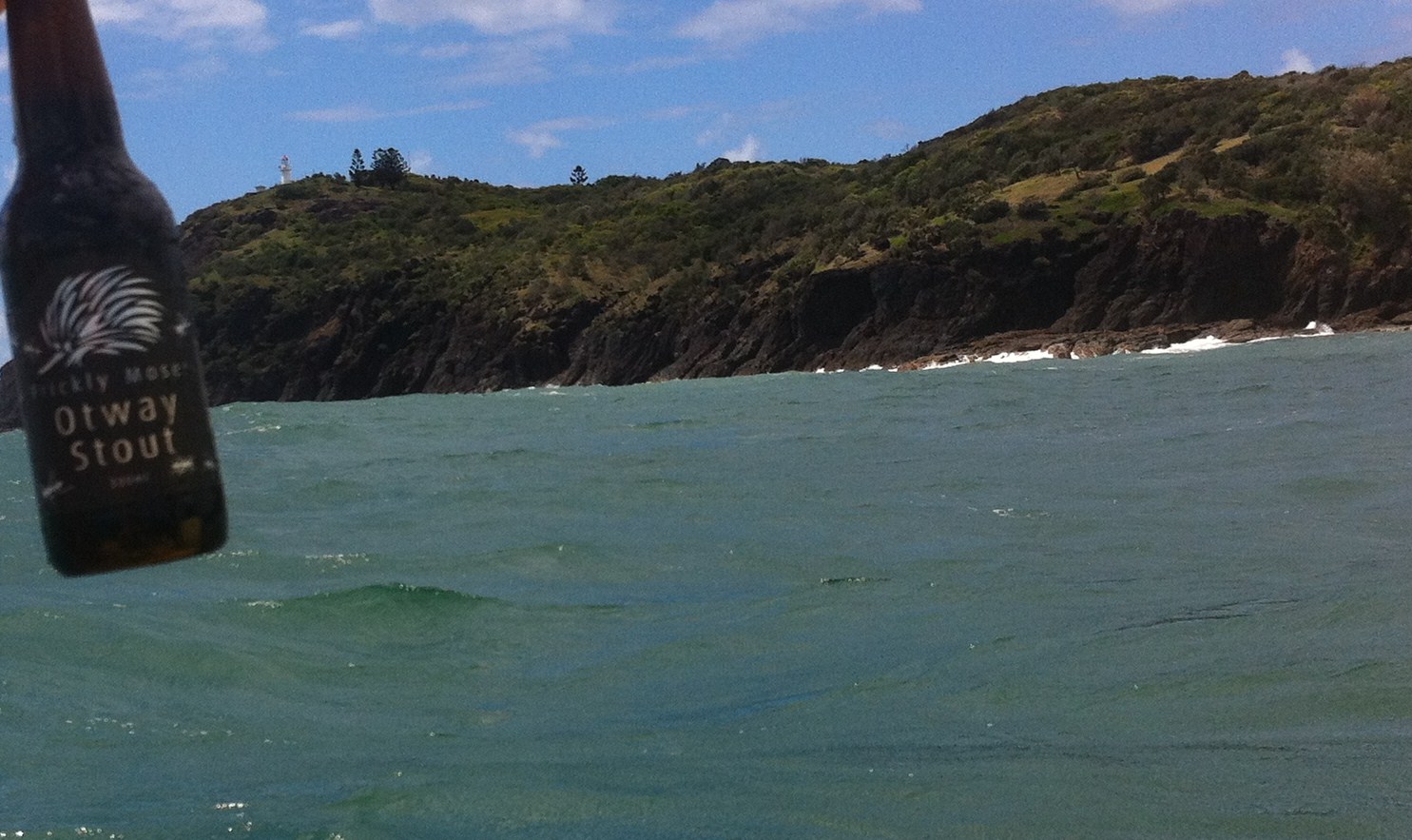 I’d packed a stubby of Otway Stout with me to Rainbow Beach and it accompanied me on a kayaking trip to view the Double Island Point lighthouse and the 90% chance of seeing dolphins. Despite the 90% promise, I wasn’t confident. My tribe had been to Tin Can Bay a couple of days before to feed dolphins that turn up almost every day. For the preceding 363 days of 2011, dolphins had failed to turn up on only 3 days. We made it the 4th in 364 days. We’d blown 99 in 100 odds – 9 in 10 seemed too long. The kayaking itself was great fun, even if my 12 year co-paddler stroked to her own unique syncopated rhythm. Double Island Point is famous for its 500m wave if conditions are right and we paddled over some healthy swell. The guide was panicking and there was more than a little relief in his voice when a dolphin and her calf(?) bobbed up close to our fleet. Their visit was very short and I was unable to get a shot of the Otway Stout next to the dolphin, so you are stuck with the lighthouse instead.