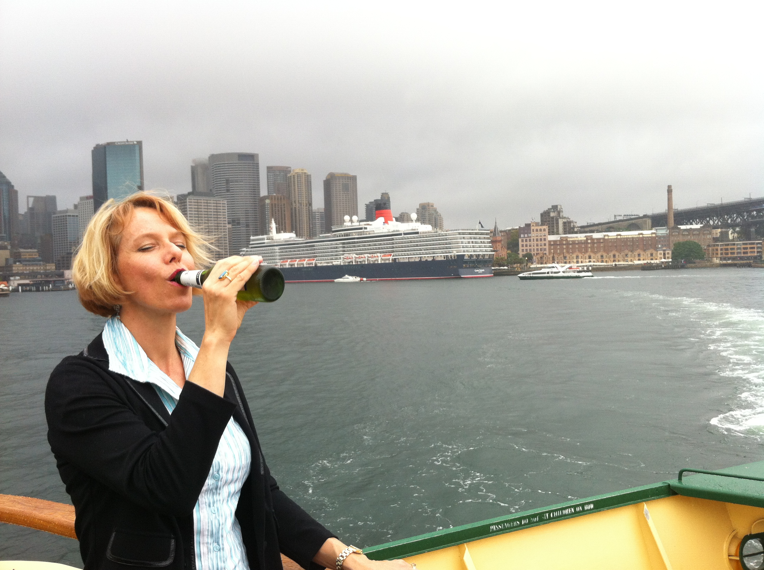 It’s been a long time between inductions. Tonight we had two. The first is Melinda, a wonderful longtime friend of this correspondent. It might have been wetter than the bottom of a submarine but Melinda enjoyed all that the Back of the Ferry had to offer. The weather was so inclement we had to move to the upstairs veranda bar, which is still techinally the Back of the Ferry. OUr backdrop was the huuuuggee Queen Elizabeth Ocean Liner. Welcome Melinda