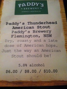 Stout was just about coming out of my ears by mid-week. 6 new stouts in 6 days. Hart’s Pub can always almost be guaranteed to have a new beer on its taps – and this week they had a couple I hadn’t see before including a hangover from their St.Paddy’s day festivities. I’m still to get out to Paddy’s Brewery at Homebush – but I’ve heard that they do great beers. I snaffled literally the last half pint of the extravagantly named Paddy’s Thunderhead American Stout. Wonderful appearance, but a confused taste – this was a stout with tang. It starts off “stouty” but then finishes spicy. Would like another to make sense of it all.