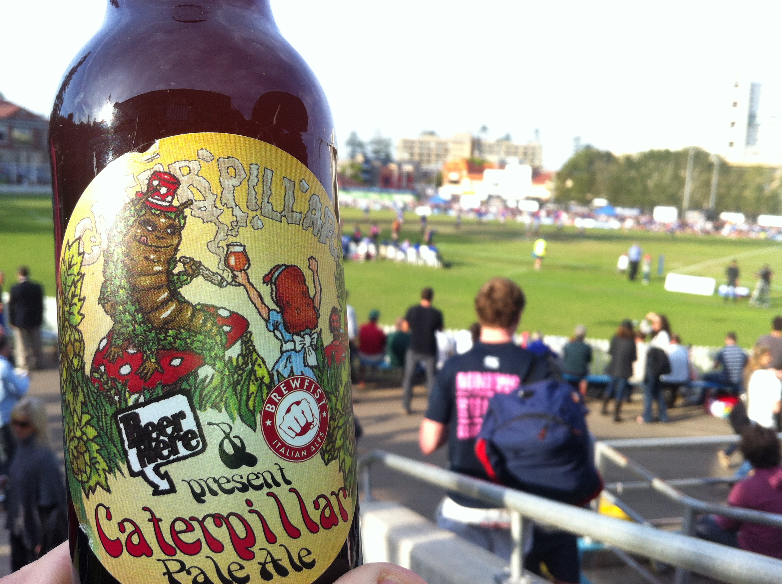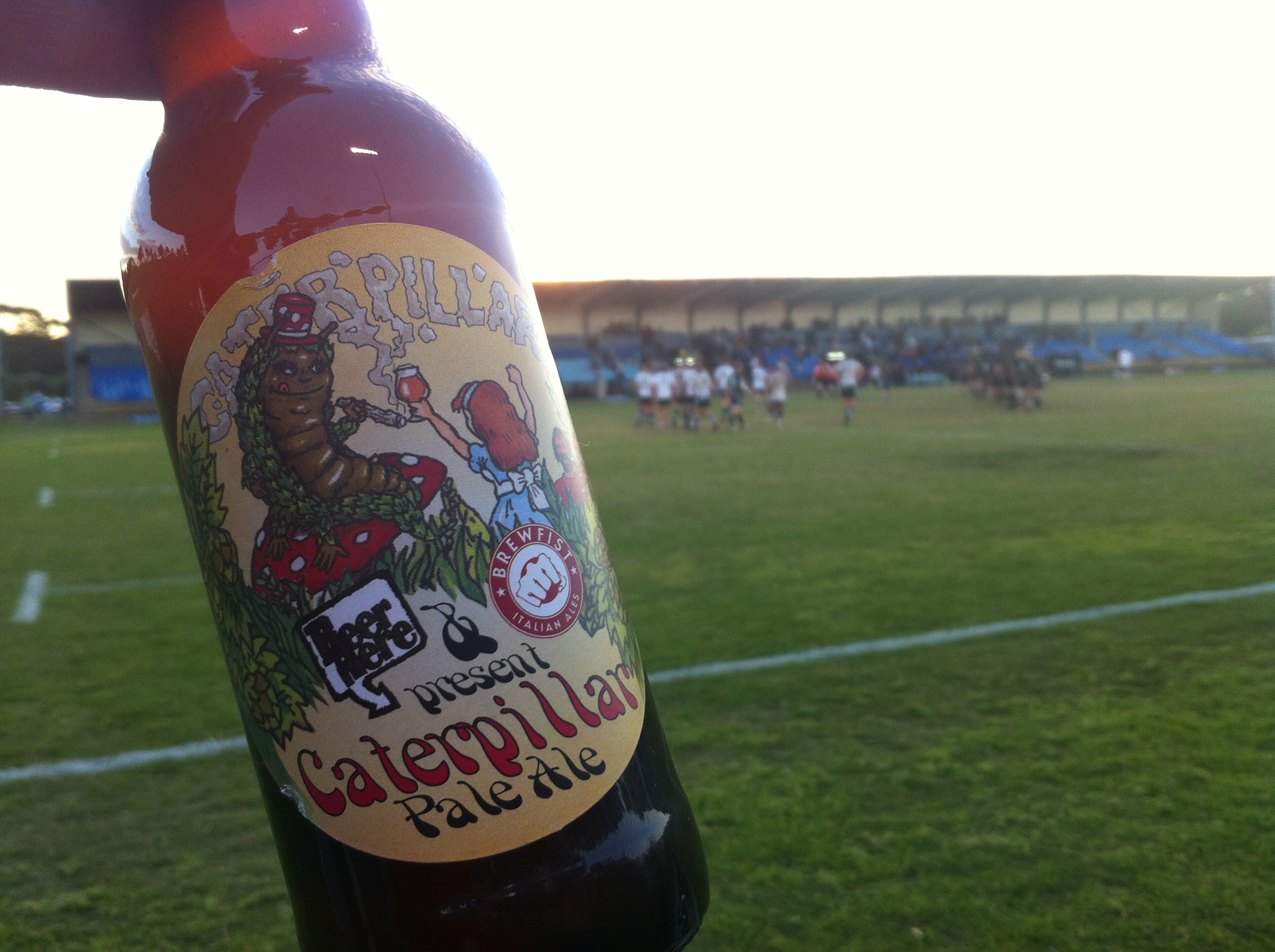 I took the Caterpillar Pale Ale to a couple of Club Rugby games on succesive weekends. Sydney Club rugby is a great Saturday afternoon activity, particularly when the afternoons are so fine. Manly and Warringah might be joined at the hip in Rugby League in the form of the Manly-Warringah Rugby League team, but in club rugby they are two fierce rivals. Manly play at Manly Oval which is a cricket oval in summer. I was lucky enough to watch the local derby between the two insular penisula rivals and naturally a rugged contest ensued. Manly won easily but the real winner was the traditional combatative atmosphere. The second Saturday was spent at Rat Park where the Warringah Rats met the once powerful Gallopin Greens of Randwick. Much to the sadistic joy of the crowd the Green Rats vanquished Randwick and consigned the “Green Slime” (the name many opponents of Randwick prefer to use) to an unprecedented 7th consecutive defeat. In fact Randwick haven’t won a game this year. The joy of club rugby is that you can enjoy the game without being cheek to jowl with fellow spectators, yet still enjoy good natured banter. It is almost sad about Randwick, but as someone who witnessed his childhood team thrashed repeatedly by the “Slime” it isn’t really that sad.