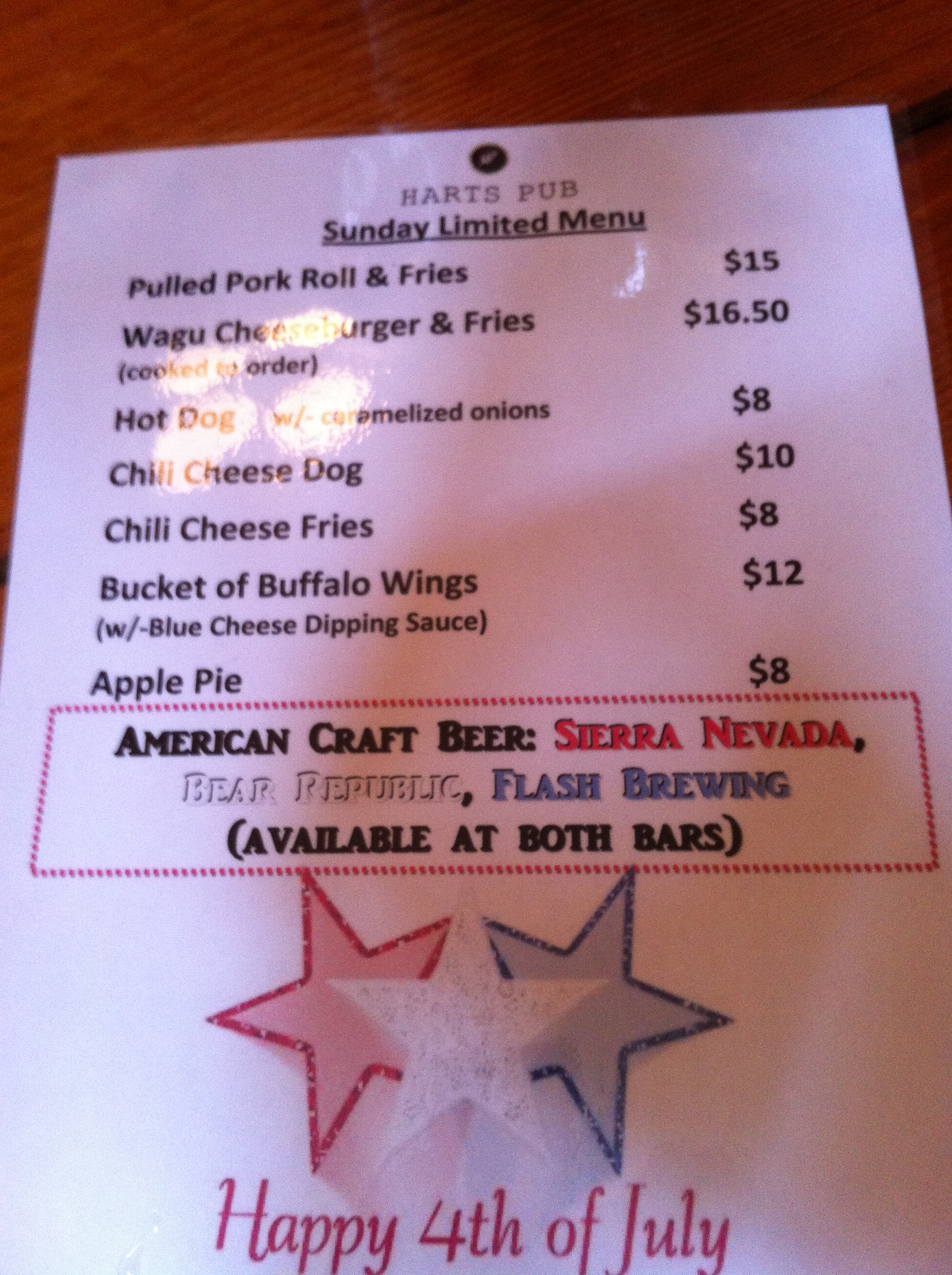 Harts Pub‘s celebration of 4th July will become a tradition if we get along there again next year. Like last year’s celebration a special menu of US culinary classics is put on for the day. Chili cheese fries, chili cheese dogs, pulled pork rolls are the go. The bucket of 20 buffalo wings for $12 is a particularly good deal. Last year, Rocks Brewing did a Red, white and blueberry Ale for the day. This year the beer choice was quite different. Seven top line US beers from 3 of the best craft brewers (Sierra Nevada, Green Flash and Bear Republic) were available in bottles.