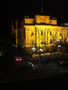After a better than average conference dinner (Coopers Dark all night), a couple of attendees were keen to have a cigar. I wasn’t up for that, but when the guy rated the bar as one of the best – I tagged along. He was a bloody good judge this fella. The entrance is modest and anonymous. A heavy wooden door opens to a flight of stairs that leads to a wonderfully old fashioned and well appointed lounge/bar/dining room where the Eastern wall consists of a wonderful round window. I would have lingered longer, but my colleagues were keen for their cigar – which we were able to enjoy on one of the better roof-tops bars I’ve been too (up another flight of stairs). The chill was taken away by an array of mushroom gas heaters and the view across to the golden lit parliament house was brilliant. In trying to find a link to their website (there isn’t one), I noted that this place tends to polarise because of price and service. No dramas – I wasn’t paying and the staff answered any question – and met any request.