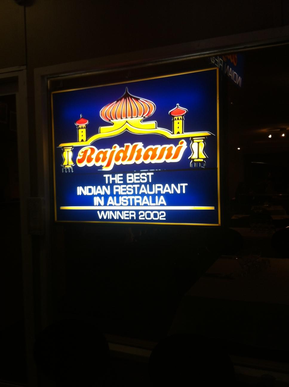 Your correspondent is spending a long weekend on NSW’s Central Coast. Two doors down from BotF’s hacienda is an Indian Restaurant in a most unlikely location. Between houses is the Rajdhani Indian Restaurant, which, if its sign is to be believed, has an impressive pedigree. It’s a big honour for a humble suburban restaurant in Terrigal, but after sampling the menu, it is well deserved. The lamb vindaloo and lamb sheesh kebabs were standouts and the complimentary mango and coconut ice cream was a fine finish. We went for the family friendly early sitting and am glad we did. The locals were pouring in and there was takeaway flying out the door at a rate of knots. Will be back.