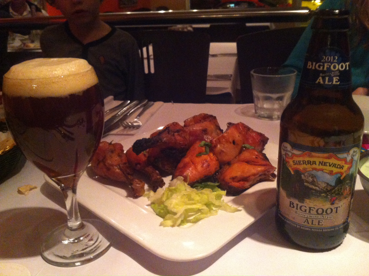 The Rajdhani is BYO and I took a single stubbie of Sierra Nevada’s 2012 Bigfoot Ale, which is a barley wine. This is another style of beer that originated in the UK that has been dialled up to 11 by the Americans. Looking through the list on Beer Advocate, this variety might actually be one of the milder ones (hard to believe). It’s a coma inducing 9.6%, but that’s pretty tame when many get into the double digits. Bigfoot is a fierce beer. It is squintingly better, and there’s a real viscousness to the mouthfeel. The hops lasts forever and if you are only going to take one stubbie to dinner this is a good one, because it isn’t a sculler. Why is it called barley wine? The only theory I can find is on Wikipedia, which because it is as strong as wine, it is called barley wine.