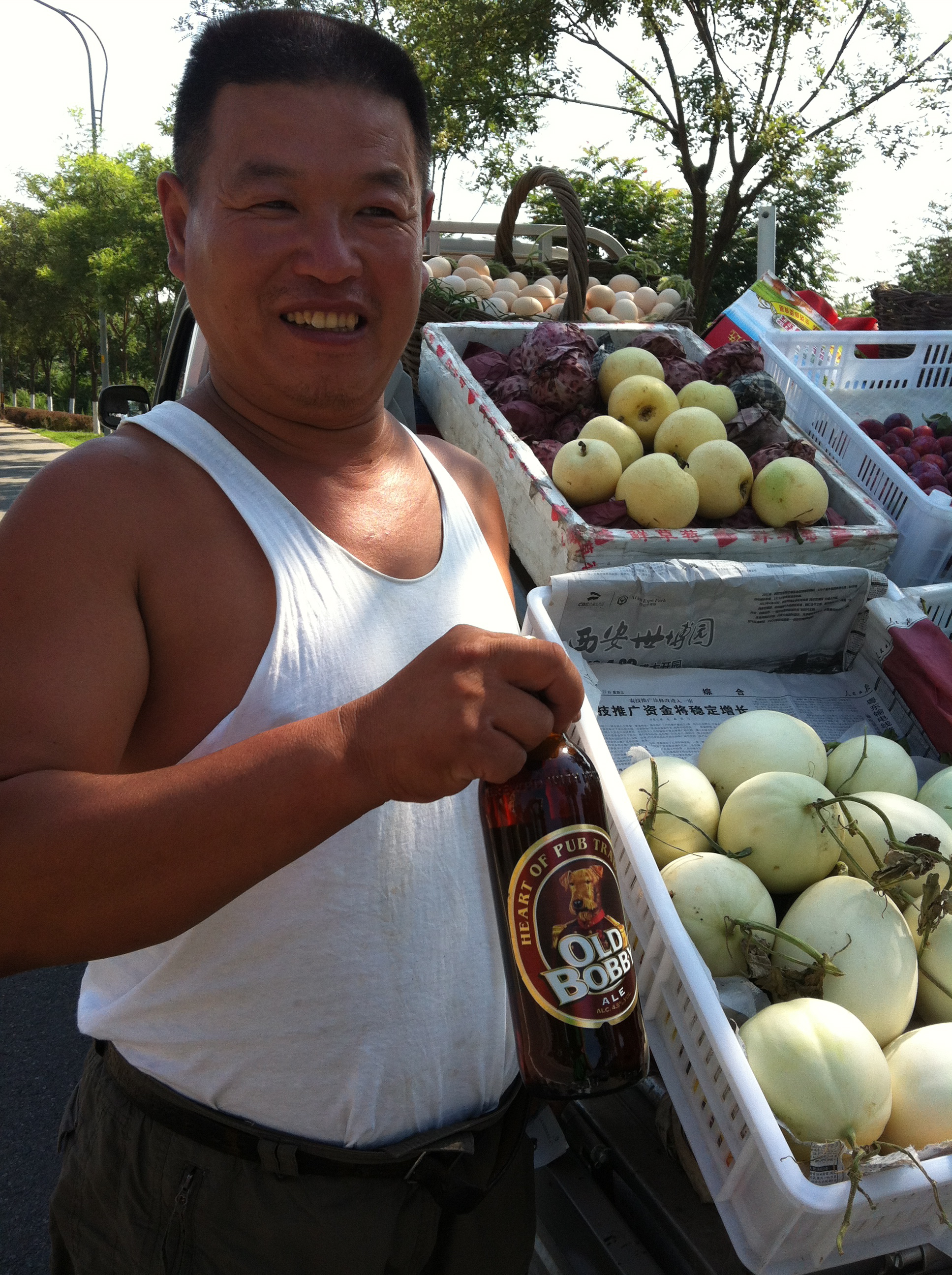 The short sojourn to Mutianyu is via narrow country roads that are littered with small stalls selling stone fruits and mellons from the surrounding locality.  The people have a happiness about them that is rare to find in the big cities of China.  On our way back we stopped and bought some fruit.  My Mandarin is now at a level that I could explain to the local fruit stall business owner the concept of BotF as a growing Global NGO, the progressive attempts of its members to review the beers of world and all that encapsulates what it is to love and be loved about BotF.  Actually that is crap (about my Mandarin) – he was totally confused and the young BotF’s kept reminding me how bad my accent is.  Having said that Mr. Zhao (his alias) was happy to assist in a photographic escapade but only after I had paid for the fruit.