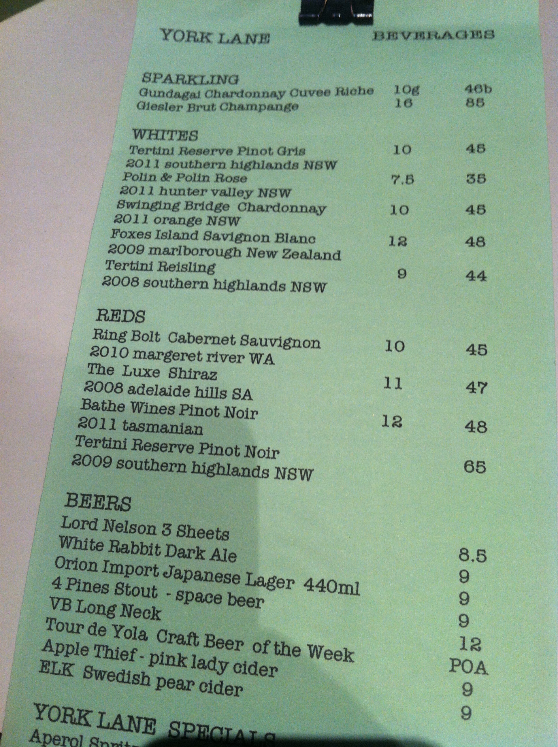 BotF went on a small tear on Tuesday night with a few work-mates for the obligatory post off-site “debrief”. We ended up at Hart’s Pub to join in their Tuesday night trivia comp. More on that, separately, but between the Mojo Record Bar and Hart’s – BotF pulled into a hole in the wall called York Lane” (Bar?), which is in York Lane north of Erskine. We were on a mission and drained our handle of Orion quite smartly, but I recognised that York Lane deserved a more relaxed and studied visit. So on clear, but bitingly cold Sydney lunchtime, I pulled in for a feed and a beer. The menu is surprising varied given the size of the place (capacity is 30 people). On another occasion I’ll have a crack at the cheese board, but given the cold – I opted for a lamb stew. Brilliant. Slow cooked, with tender chunky shreds of lamb in a rich tomato base and plump cannelini beans – this was perfect winter fare. Mightn’t have been big but it was wholesome. These fellas work hard and York Lane is open from 6.30am to 10pm (Mon – Wed) or 12pm (Thurs – Fri) and on Saturday evenings.