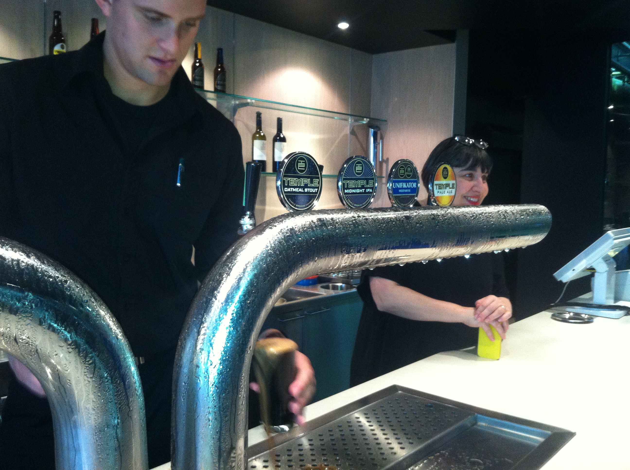 According to one of my Melbourne insiders a detour via Temple Brewing on the way to Tullamarine from the city was not a big deal. Grab a cab at 3pm, pull in to Temple Brewery and Brasserie, have a pot of Oatmeal Stout, jump back the cab and be on the 5pm back to old Sydney town. Sounded easy. The cabbie wasn’t so sure, but took on the challenge. Despite having the exact address, we actually drove straight past it, because Temple is in an unlikely building in between two light industrial factories. Once you swing open the black door though, you are in craft brew heaven. I only spent time downstairs in what is a modestly sized bar, but the backdrop is terrific. Gleaming brewing equipment is visible through floor to ceiling glass windows.