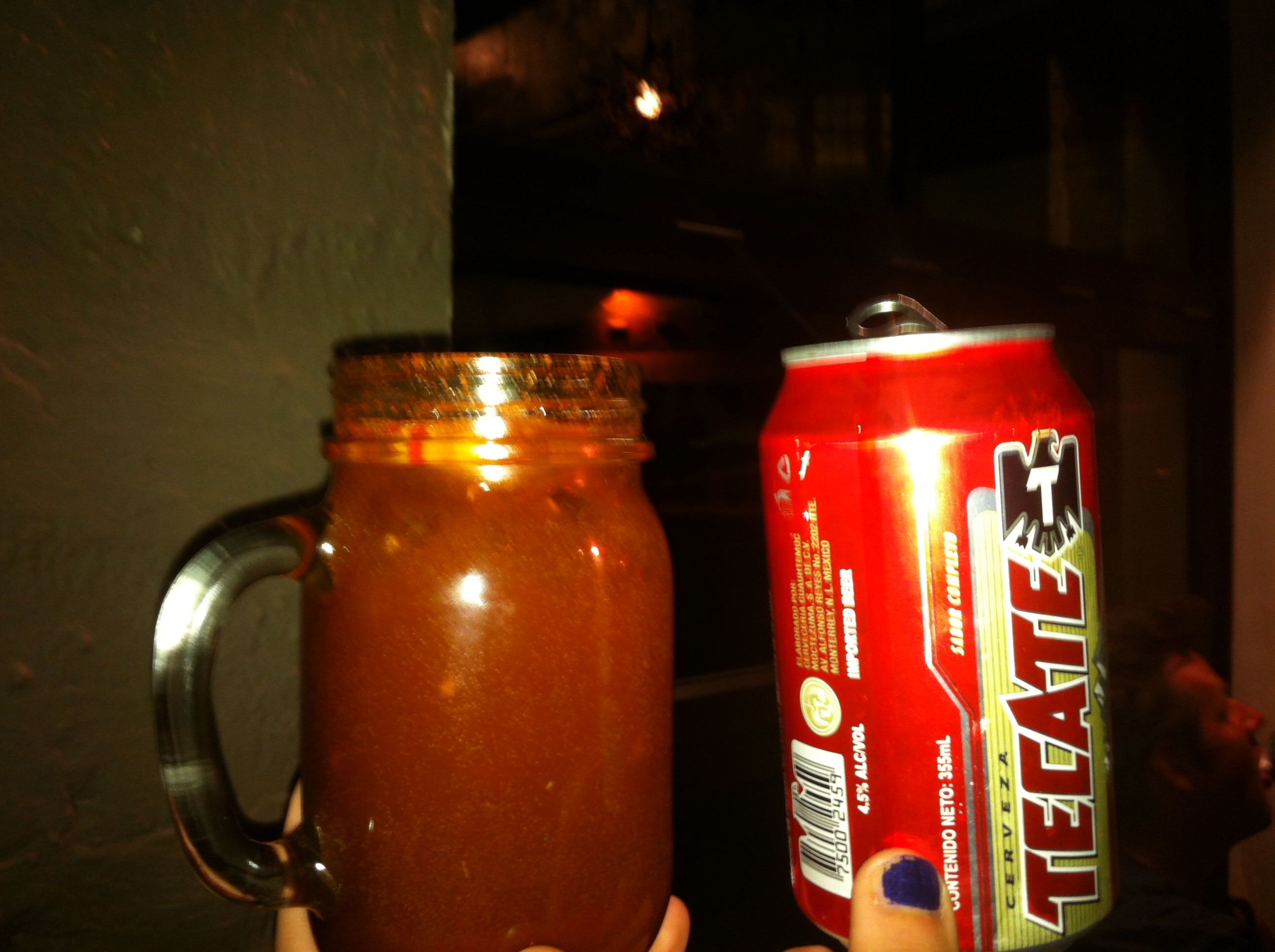 Not being a massive cocktail drinker, actually not being a cocktail drinker, I’m not sure which cocktail causes the most debate around what is the “classic” recipe. I know that martinis have multiple versions and cocktail barmen are always putting a spin on traditional drinks. A quick perusal of the internet indicates that there are many, many ways to make a Michelada. Chica Bonita’s version does look pretty traditional – Tomato Juice, lime, chilli flakes, Worcestershire Sauce, hot sauce, ice, salt and beer. The variety occurs around Tomato v Clamato, no Clamato or Tomato, the variety of hot sauce, soy sauce (in or out), the version of spice (paprika, garlic pepper, cayenne or diced jalapeno). It is fair enough for an Australian bar to omit the Clamato (a blend of tomato juice and clam juice, which costs $14.50 for a 2l bottle) – but everything is widely available. One to try at home, I reckon, and a blando beer like Tecate is just made for a drink like this.