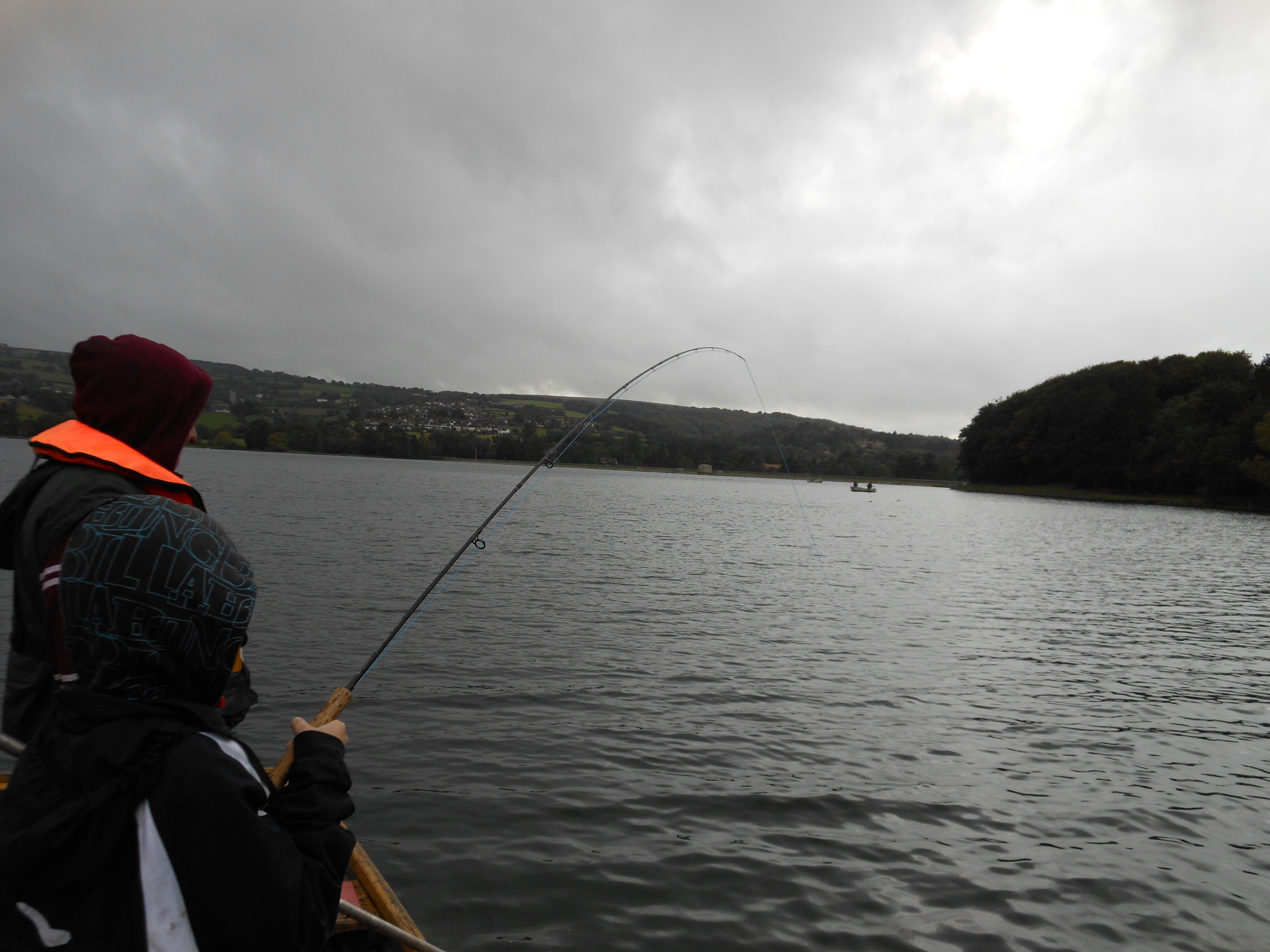 Fished Blagdon lake last Monday in showery conditions with younger brother and my son. Winds were from south west with strong squalls of wind and rain keeping it suitably fresh with small interludes of sunshine. The boats at Blagdon have no motors, which means a bit of a workout with the oars, although we noted and cursed some anglers with their own electric motors.