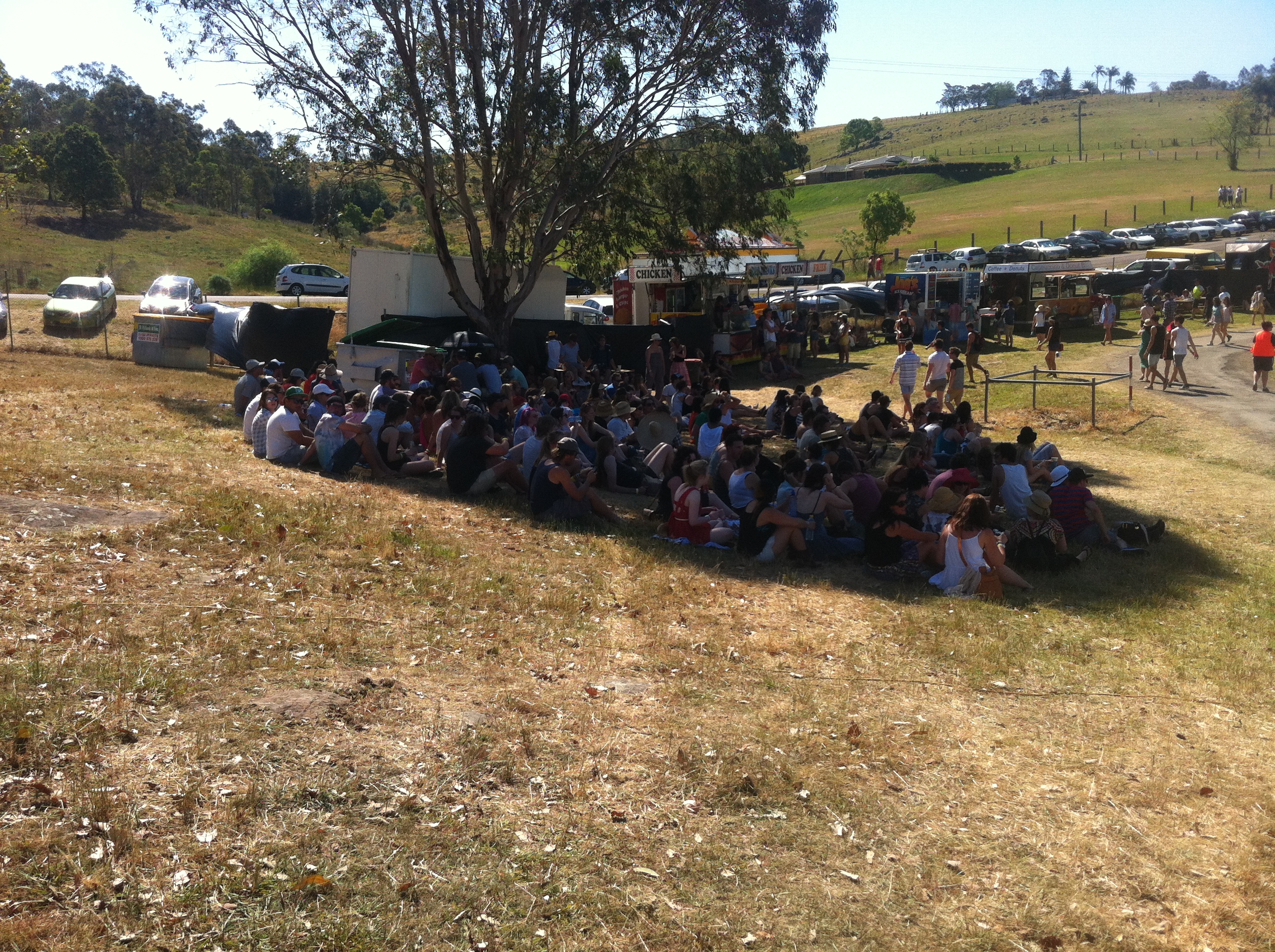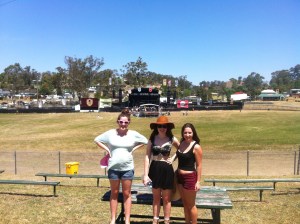 My 18yo travelled separately (funny that), but my other two daughters and one of their friends fanged it up to Gresford (where we camping) – pitched our tents and then got the shuttle bus to Dungog, which had added 12,000 people to its usual (about) 2,500 usual population. Dungog was heaving – both pubs were bulging – and the atmosphere was full of anticipation and bon homie. We arrived at the showground, secured a good spot (not hard) and then melted. 35 degrees celsius and the clearest of skies. The only missing was flies. It was a tribute to the concert-goers that I didn’t see a single person get carted off with heat excursion. The free water, sprinklers and the occasional spray from the fire brigade helped. That – and I reckon the crowd was filled with hardened festival goers that have endured Big Day Outs where temperatures have hit 40 degrees.