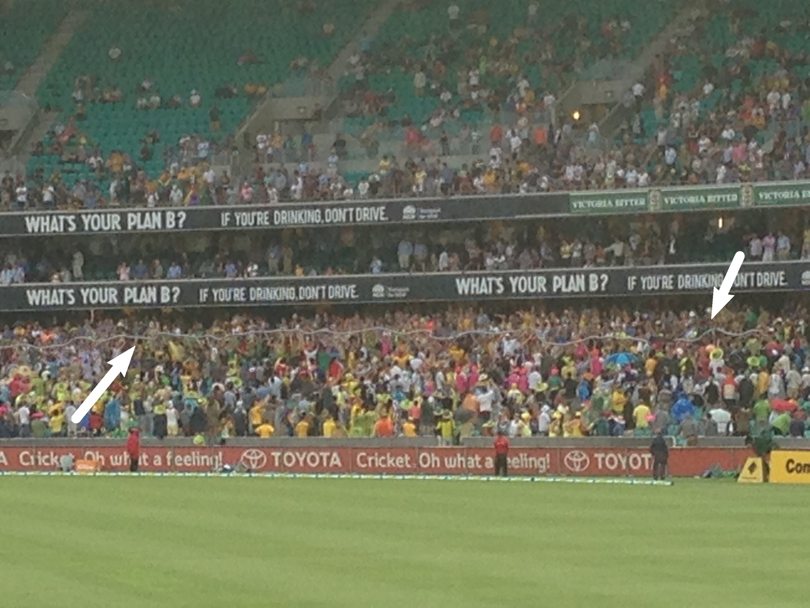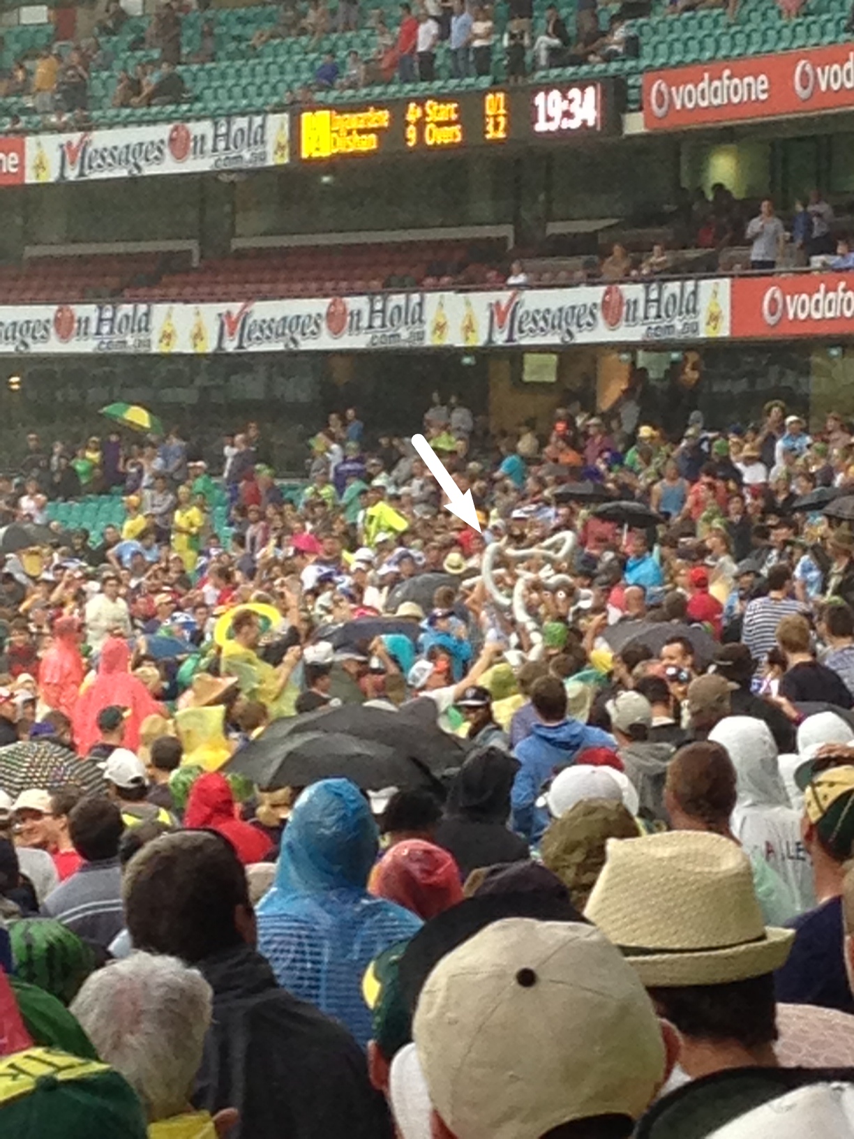 About 20 minutes after the players came off the field due to rain the crowd got restless. More experienced observers noted the start of several smaller “snakes” at disparate locations in front of the Victor Trumper Stand. Every 10 minutes or so, as each of these smaller “snakes” was married to another, the crowd would cheer. Slowly the larger “snake” emerged and we knew something special was afoot. |
