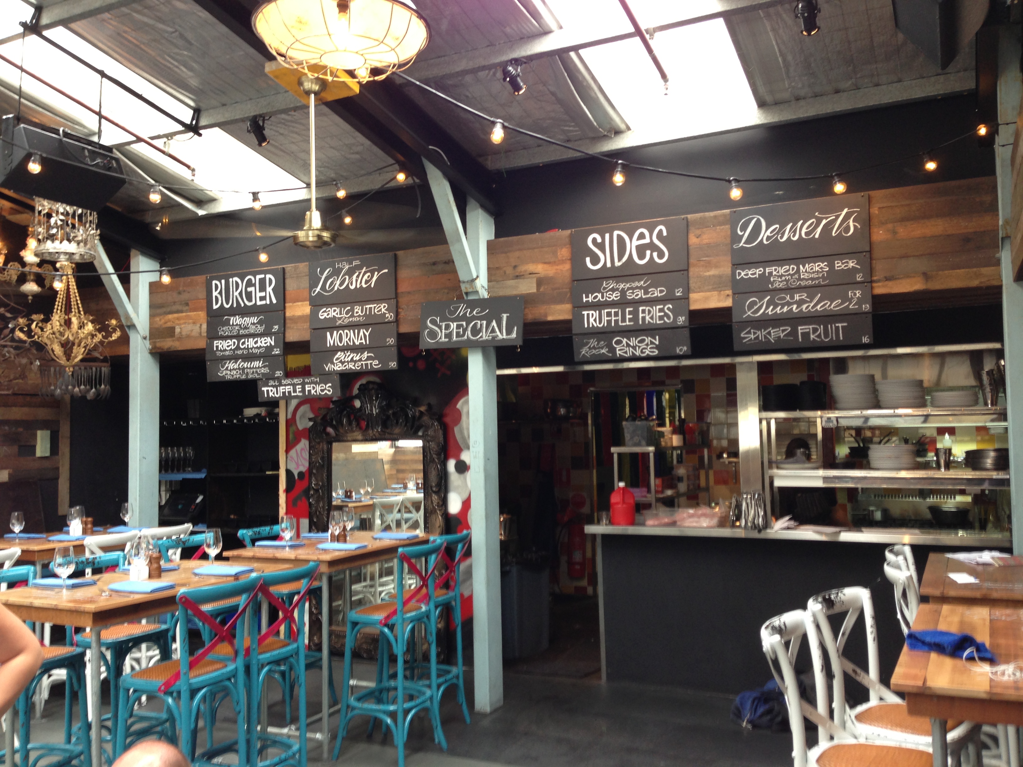 I didn’t bother to really check out the cocktails. The beer list is compact and probably changes regularly, given that it is handwritten in chalk on a blackboard painted door. The choice ranges from Cascade Light to Trumer Pils to Kooinda Golden Ale. $11 for a Trumer Pils is a little steep and this is definitely a place to be on someone else’s coin. The food choice is outstanding – so long as you like Burgers or Lobster. 3 varieties of each. $50 for a half lobster. There’s also a desserts menu including the great deep fried Mars Bar.