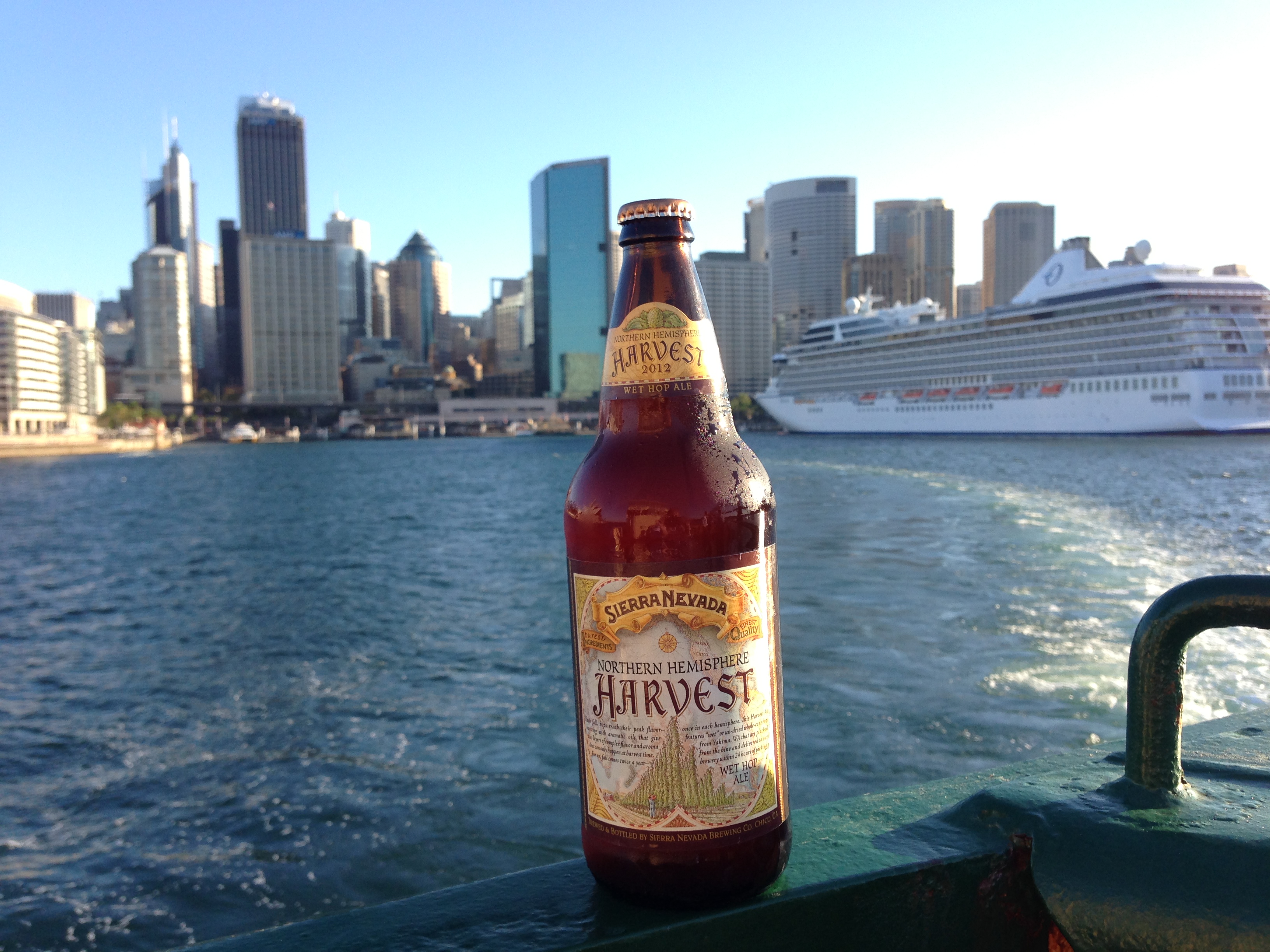 It’s been a long between drinks for a classic BotF post that is simply about a beer drunk on the Back of the Ferry. That’s what tonight’s post is. On the way to Circular Quay I pulled into Vintage Cellars on Carrington Street and spotted a 2012 vintage of the Northern Hemisphere Harvest made by Sierra Nevada. This is a special beer that is deserving of the full Back of the Ferry beerp0rn treatment. That includes the iconic Opera House shot, which on a blue Sydney day like today just doesn’t get any better. Normally the yacht frenzy occurs on a Friday evening, but tonight the stiff breeze had all sorts of yachts beating, tacking or whatever it is that they do. Happy to sit on the stern and watch.