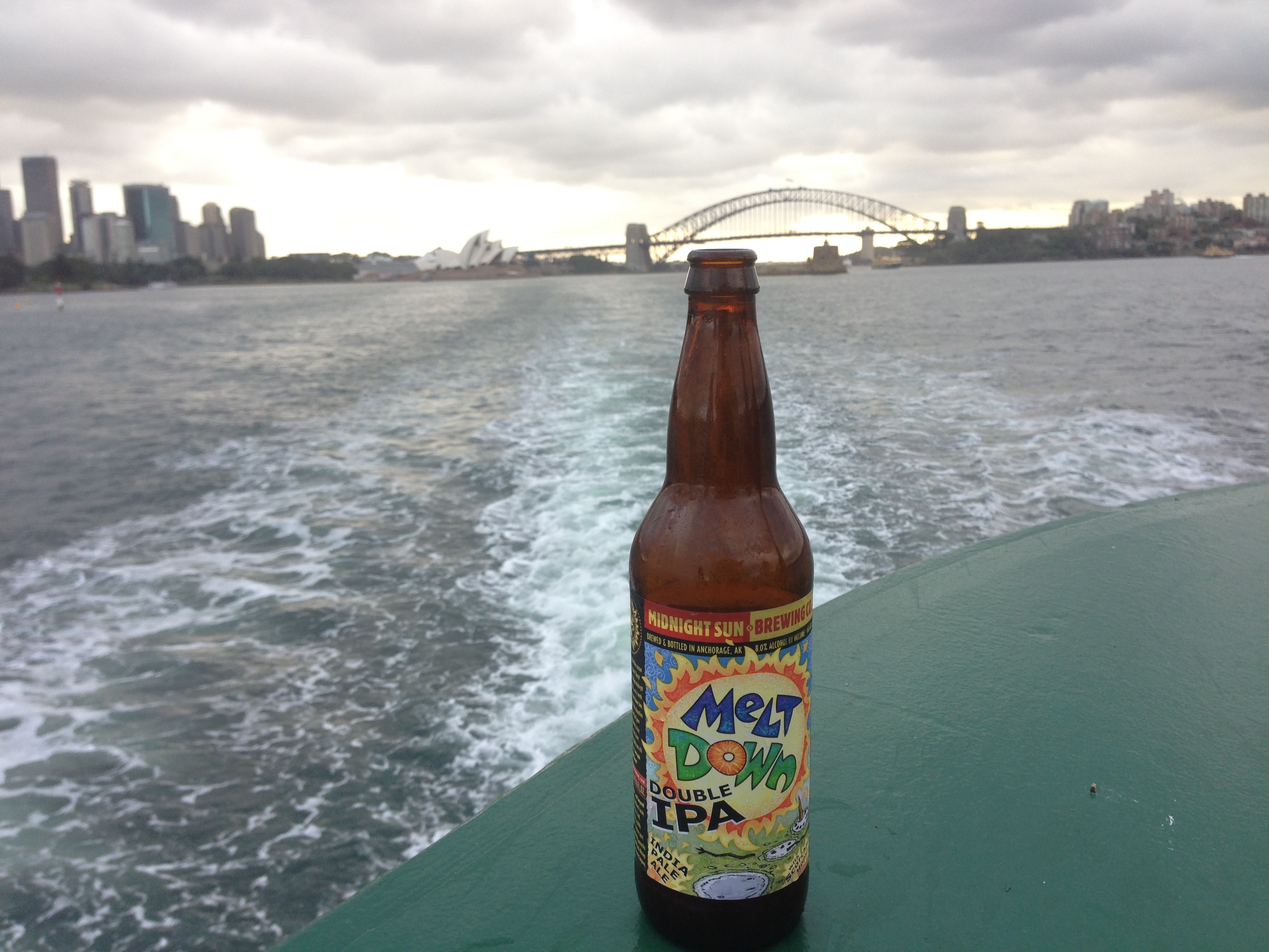 Over the years, Back of the Ferry’s great friend and member – Rachel – has bought back some remarkable beers from the United States. Her most glorious moment was when she bought back a Pliny the Elder, which was given the royal treatment on Sydney Harbour. Like most of the US beers that have been tried on Back of the Ferry, Pliny the Elder came from California – as did the most recent of Rachel’s offerings, Sculpin IPA. Rachel challenged a bottle-shop proprietor on her most recent trip to find something really out there – and there’s no doubt she delivered. Firstly, this beer is from the United States and not from California and secondly a Double IPA is not the most common variety found in Australia. Meltdown Double IPA is made by the Midnight Sun brewing Co. which is located in Anchorage, Alaska. They’ve been brewing since 1995 and make a solid range of all-rounders with suitably Alaskan names like Sockeye Red Ale and Kodiak Brown. There’s also the delightfully named Panty Peeler Tripel – enough said. Meltdown is one Midnight Sun’s annual seasonals and is designed for summer drinking. This is a meaty, meaty IPA. Sniffing it is half the fun, but drinking/chewing this down is even better. I was expecting some heat from the “scorchin’ hops”, (none there), but there was no shortage of bitterness. Meltdown weighs in a squinting 80 IBUs and it got the better of illiards, who retreated to the relative comfort of a Vale IPA. I loved it – a sensational sipper and one worthy of the Back of the Ferry full beerp0rn treatment.