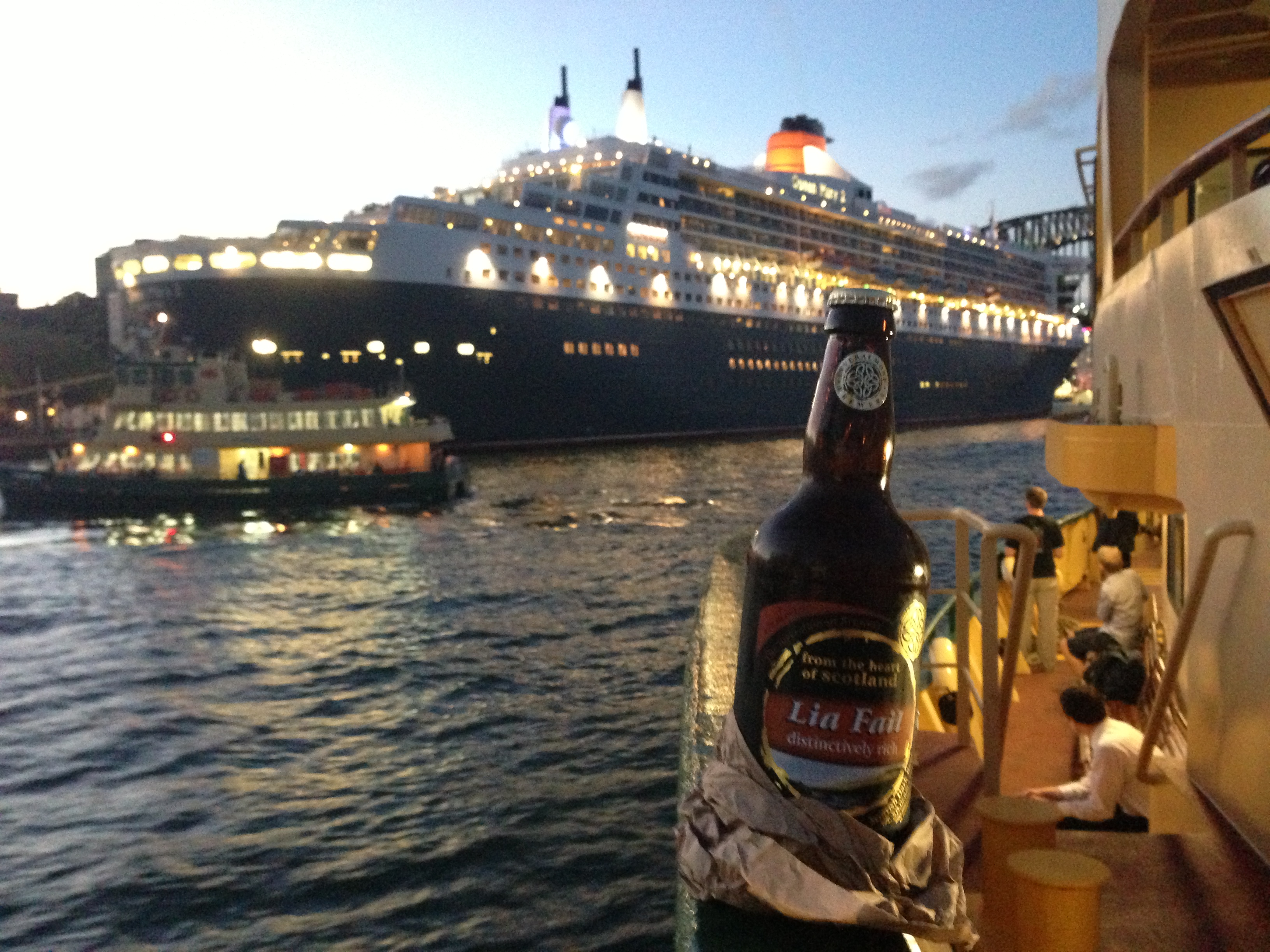 Coincidentally (or so I thought), the beer I’d picked up on the way to the ferry had a good link to the Queen Mary 2. Lia Fail is a dark beer made by the Inveralmond Brewery that is based in Perth, Scotland. “Bewdy” I thought, “I’ll toast the Queen Mary 2 no doubt named after Mary Queen of Scots with a Scottish beer”. Good plan, but the Queen Mary 2 is named for present Queen Elizabeth’s grandmother, who was actually half German. I still toasted the Queen Mary 2 with what was a beer suited for a less balmy night. Really good, malty, rich taste. Tasted like it would more alcoholic than its 4.7% – but I’d nail a couple of these when it gets a little colder.