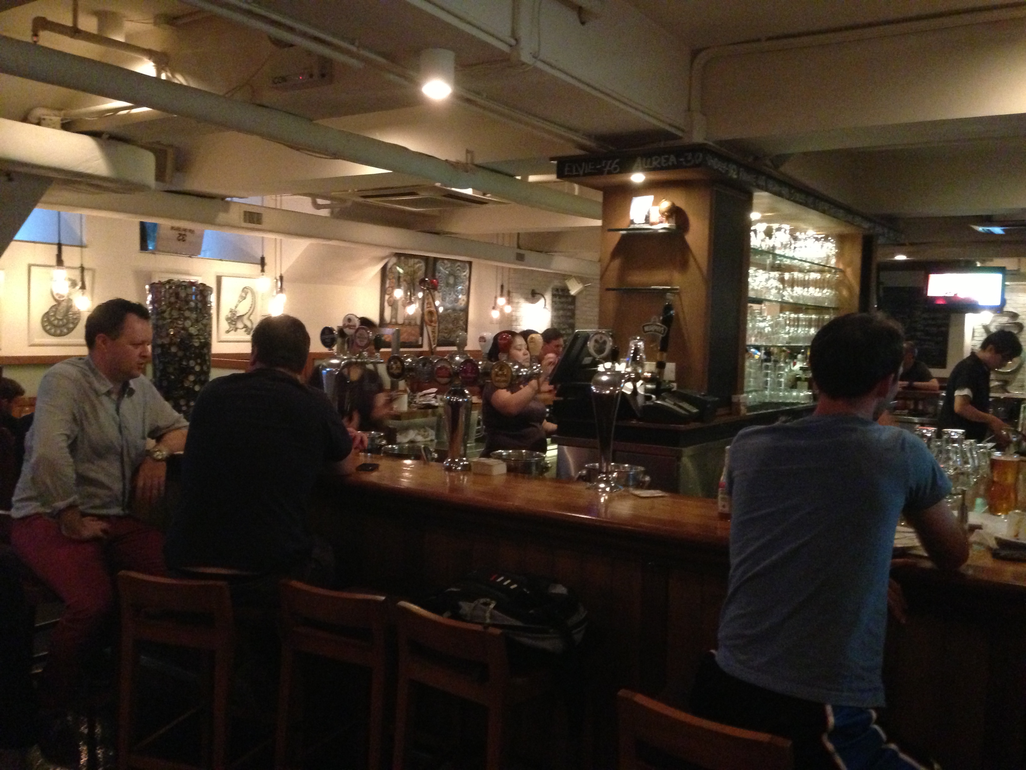 The beer menu is broadest in its bottles (upwards of 75 beers) and there was a random range of brewers and nations offered. I think that the list changes all the time – and the paper menu didn’t list the 4 varieties of Stoke Bomber that were scrawled above the men’s urinal. I hadn’t tied the Smoky Ale before – well worth it. Nothing like a Rauchbier, just a very pleasant lightly smoked flavour balancing good malt. The food menu is pub classics with some slight nods to more modern fare (Pork and Peach something or other). Big pies are a speaciality with about 8 varities being available.
