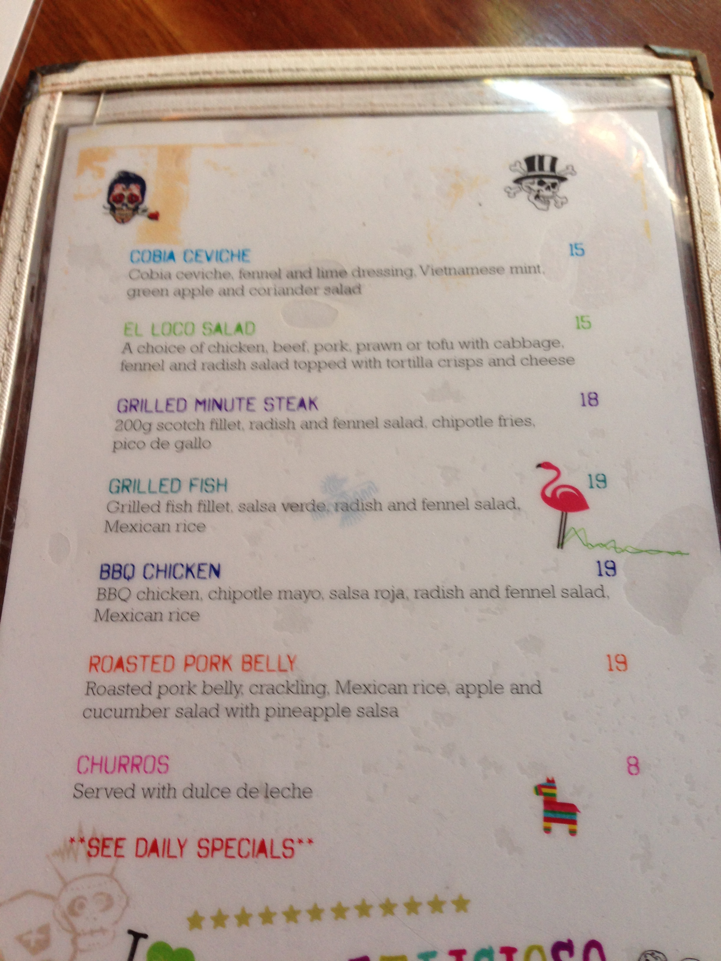 So, when Cam suggested a quick farewell beverage to Kiwisinoz, it was about convenience more than anything new. Well, surprise – surprise, the Slip Inn’s had a Mexican makeover (day of the dead wallpaper) in the front bar and the menu’s been updated to match. There’s a Mexican cocktail list and plenty of tacos, quesadillas and churros as well as some main courses – featuring grilled meats with various Mexican sauces. The menu’s hardly haute cuisine, but the hot dogs we all had and the Chorizo and Jalapeno quesadilla I snuck absolutely hit the spot when speed and substance were key. I’ll definitely be back for another crack at the menu including some of the more substantial specials featuring ribs and the like. It’s all under the name El Loco at Slip Inn, and is apparently the brain child of one of Merivale’s star chefs – Dan Hong.