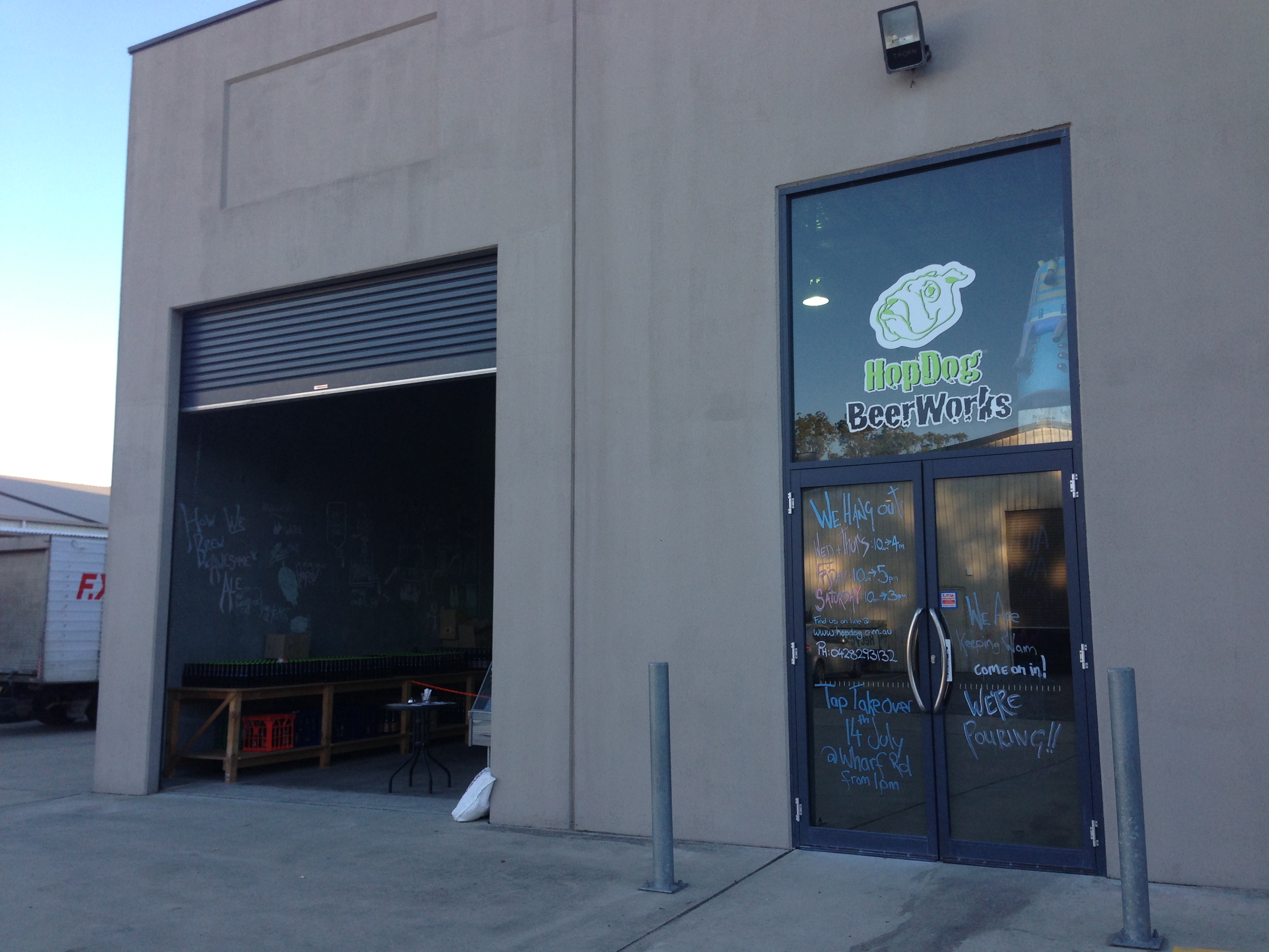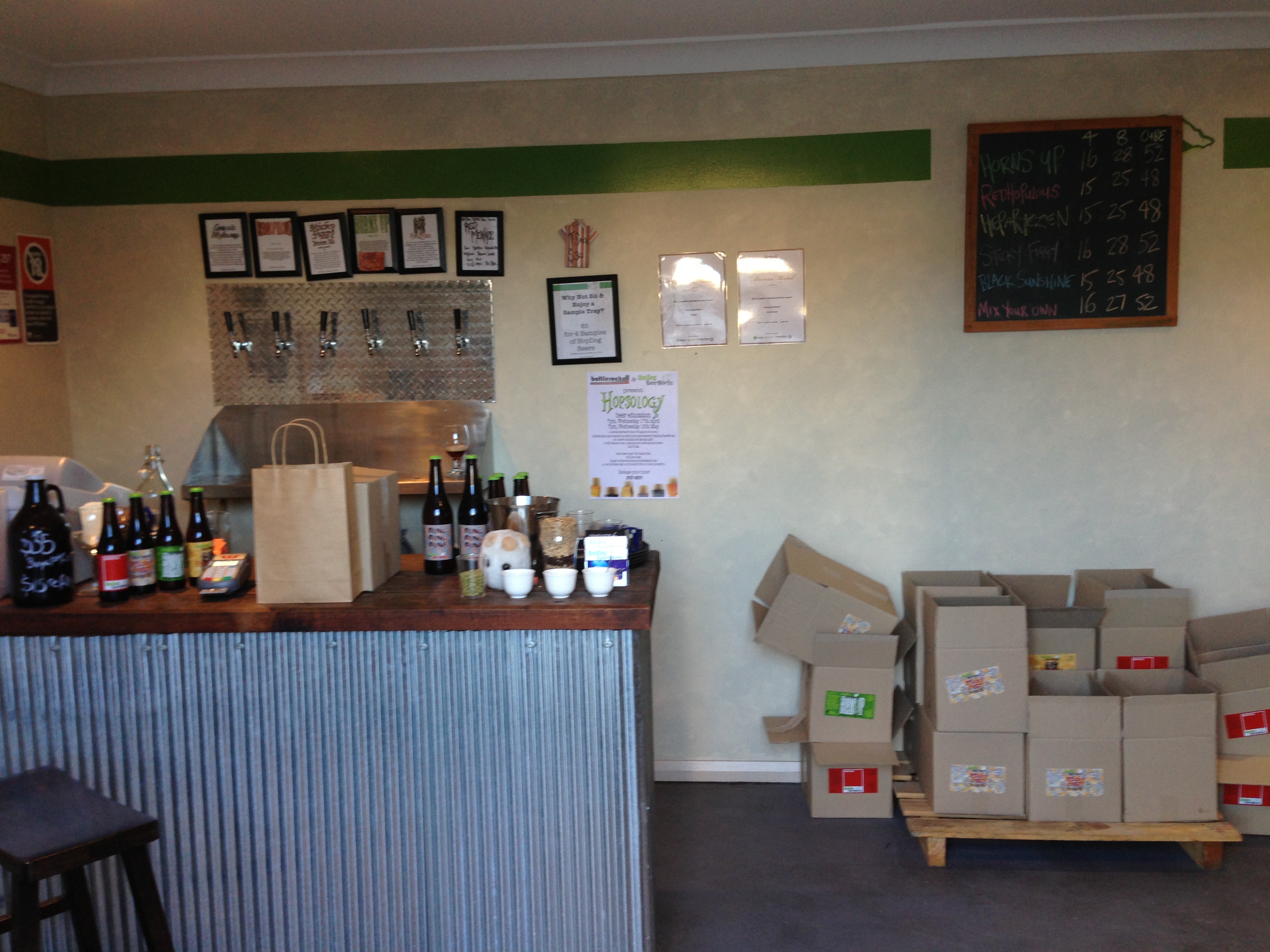 We’ve paid homage to HopDog before on these pages. Black Sunshine is one of my all-time favourites and All Hallowed Ale is one of the best named beers and the best pumpkin beer I’ve consumed. I was very much looking to having a sample and stocking up. Hop Dog Brew Works can be found at 2/175 Princes Highway, South Nowra. That’s on the right hand side, and is south of a ridiculously large Bunnings. There’s plenty of parking and it is a cosy little tasting area at the front of house. 6 taps are on the go for tasting, plain old drinking and growler filling. Tim Thomas – brewer and owner – is a friendly fellow and is happy for you to walk around at what he boasts to be Australia’s smallest brewery.