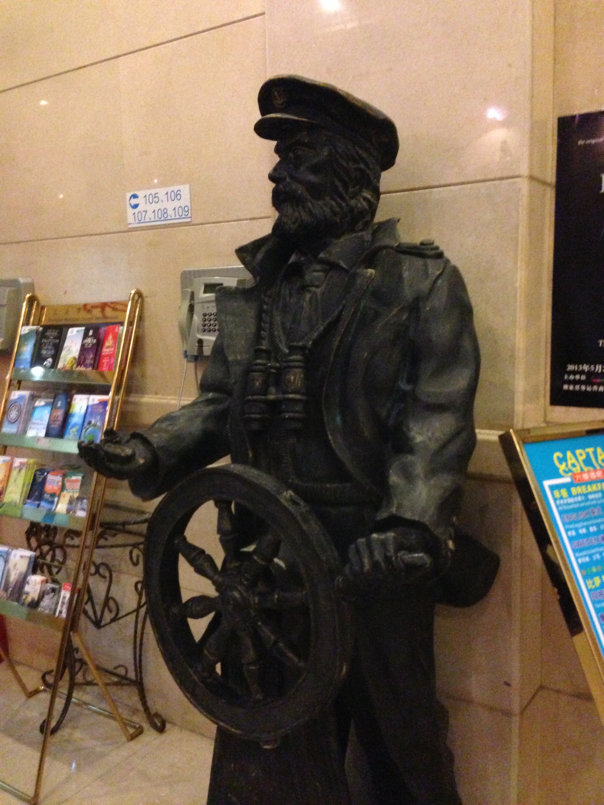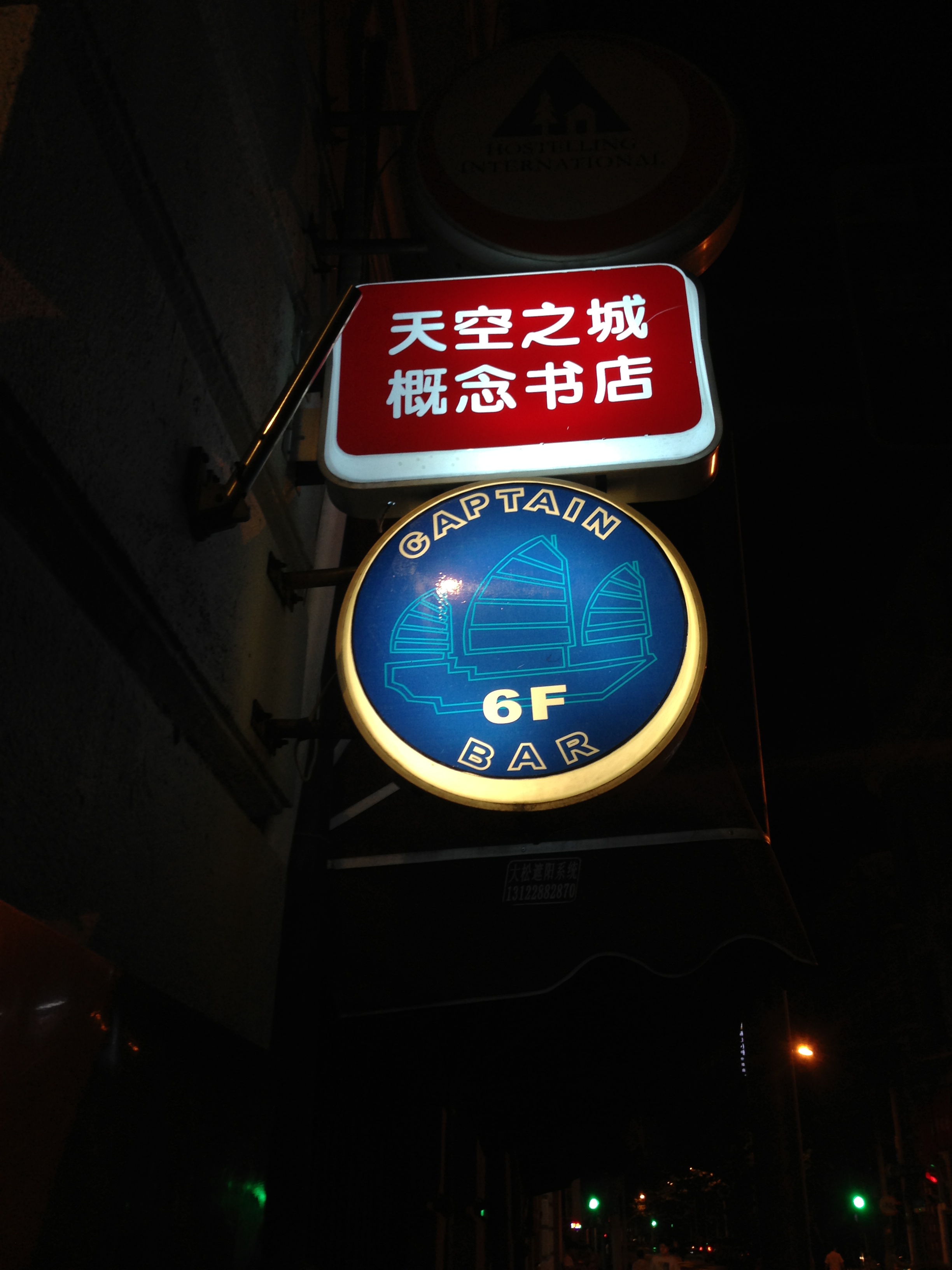 Our last stop was Captain Bar. This is a rooftop bar on top of a hostel, which is a remarkable find in amongst such high end accommodation. You pass by the eponymous Captain on the way to the clapped out elevator. You hop out at the fifth floor and walk up a set of metal stairs and you enter one of the darkest bars of all time. It is a shame, because the inside of Captain Bar is designed to resemble an old boat. The main source of light is a set of illuminated tapheads that guide you to the bar. The star attraction of Captain Bar is the outside drinking area with its views of the Huangpu River and the Pudong Skyline. TfT and I grabbed a couple of tankards of Tsingtao (60RMB or $10.60) and took in the view from Captain Bar, which is el primo and just about justifies the price. At 11pm, it was still a ridiculous 35 degrees.