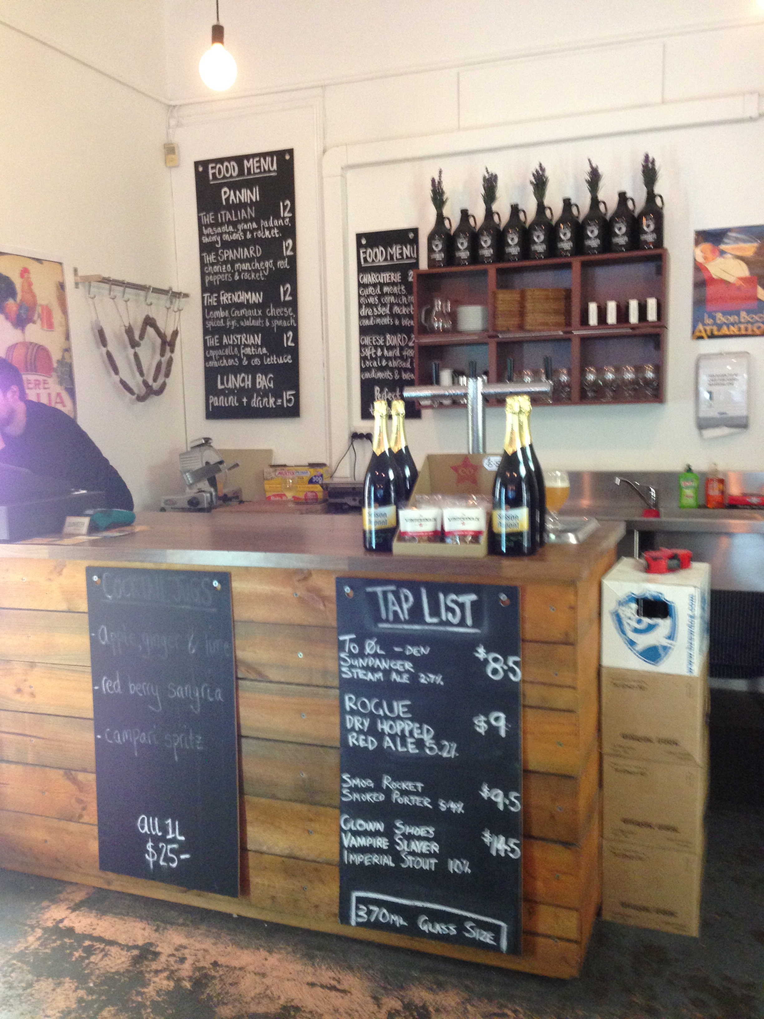 The second beer we tried, which was ideal given the miserable cold afternoon Melbourne had laid on, was a Smoked Porter with as good a back story as the Sun Dancer. Smog Rocket is made by Beavertown Brewery, which is based in London and has as one of its co-founders, the son of the legendary Robert Plant (Logan’s story is told here). It commenced life in a pub, but has now moved into stand-alone premises. Whilst there is the temptation to sicker at the name, “BEAVERTOWN WAS THE OLD COCKNEY NAME GIVEN TO THE HISTORIC DE BEAUVOIR AREA, FAMED ACROSS VICTORIAN LONDON FOR ITS RICH CHARACTERS AND INFINITE REVELRY“. We’ll take ’em at their word. The beer is beautiful. Smog Rocket pours black, but not too viscous. It is rich and satisfying, and eminently sessionable – despite its smoked quality (I often it a challenge to back up immediately on a smoked beer). The other two taps had great stuff including a 10% stout from Clown Shoes. Tempting – but Cam had another establishment to show me. Slow Beer – I’ll be back.