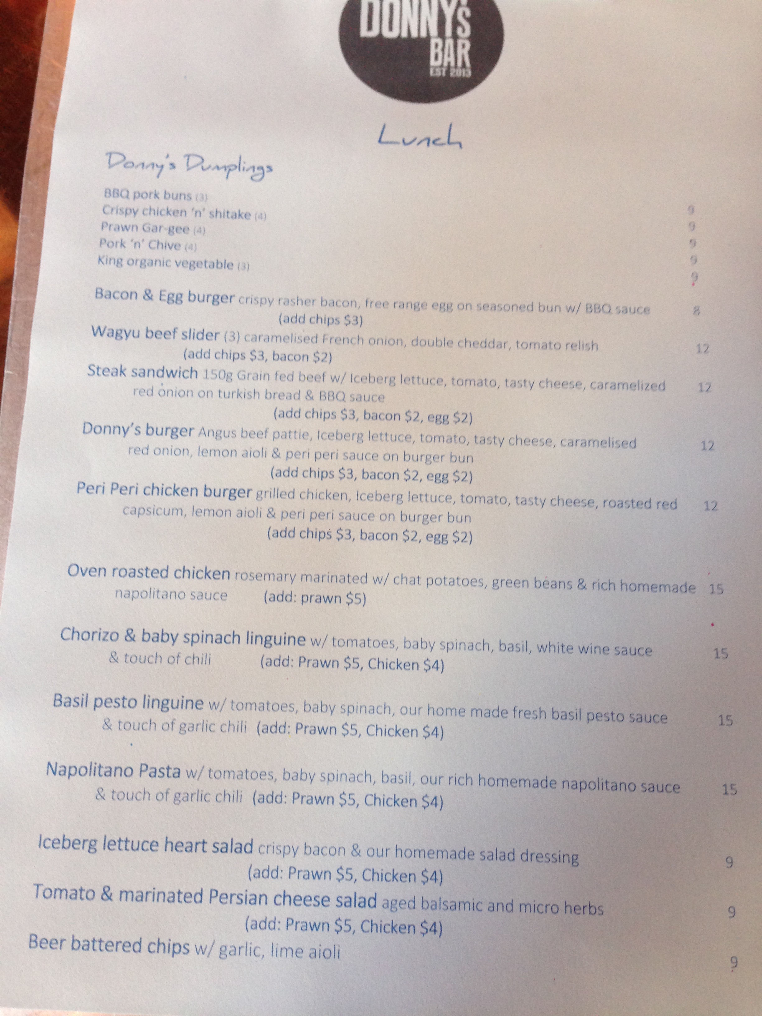 Donny’s Bar might have a size issue on the keg front and it’s cocktail menu is far more extensive that the beer menu. When I visited there was one beer on tap – Monteiths Pale Ale – and there were pouring issues. Dad & Dave’s #1 Pale Ale is available in stubbies along with a couple of Murray’s varieties. It looks like Donny’s is a night time venue with an emphasis on live music.