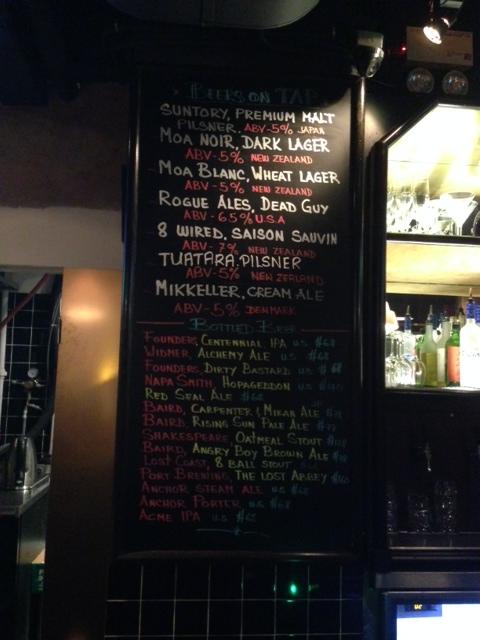 Not to hard see why. They’ve got a great range of tap beer coming out of a wall of taps. The Kiwi beer salesmen are doing their job as 8 Wired, Tuatara and Moa were represented along with Rogue and Mikkeller. Not advertised, but available was a wheat beer made on sight. Must be bloody new or Tipping Point hasn’t heard of Untappd because I was just the second check-in-erer. Totally potable without being a cracker. 4 Pines – send ’em a keg of the Hefeweizen to show ’em how it’s done.