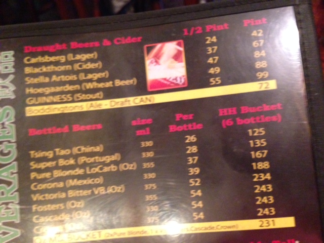 I finally reached the Old Taipa Taverna. It’s a beautiful old building with the Galaxy Casino complex juxtaposed in the background. The bar itself is all dark wood and is clearly another expat hang. The tap beer list includes Guinness, but at $13.80 a pint, I opted for watery Carlsberg. The best value is a bucket of 6 Tsingtao stubbies for $17.50. Setanta was on so I was able to catch up on Super Rugby. Service was shite and they wanted to hit me up for $10HK to charge my phone.