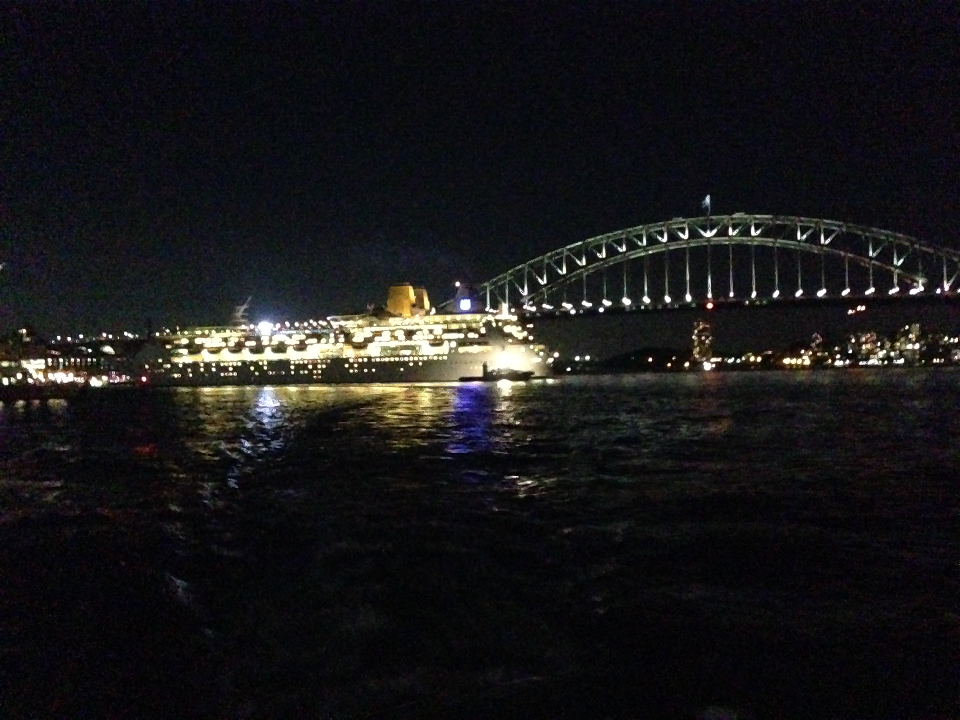As Dorothy once said “There’s no place like home”. Too true, and it was wonderful to Back on the Back of the Ferry with a full turnout of the Foundation members – illiards, Lamb0, pommy_ch, oomploloompa and yours truly. It might have been dark, but the air was mild and the view as always spectacular. The Rhapsody of Seas let off a few blasts and for a moment it looked we’d be blocked for a run, but the MV Narrabeen claimed home town privileges and we were given an inside passage. We were rewarded with a marvellous view of the cruise ship silhouetted by the coathanger. Great to catch up with the lads – with my first Australian beer in 11 days – the go-to Coopers Green Pale Ale.