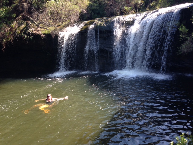 There’s other attractions near the Falls. A highlight is Nellies Glen, which is on the right before the falls. A 100m walk through the bush brings you to a large pool backed by a broad 4m cascade. It is a magical place. The pool is quite deep, but you can walk around the edge and get in behind the waterfall. The water might get warmer, but a couple of hardy ones amongst us got in and made it behind the tumbling water.