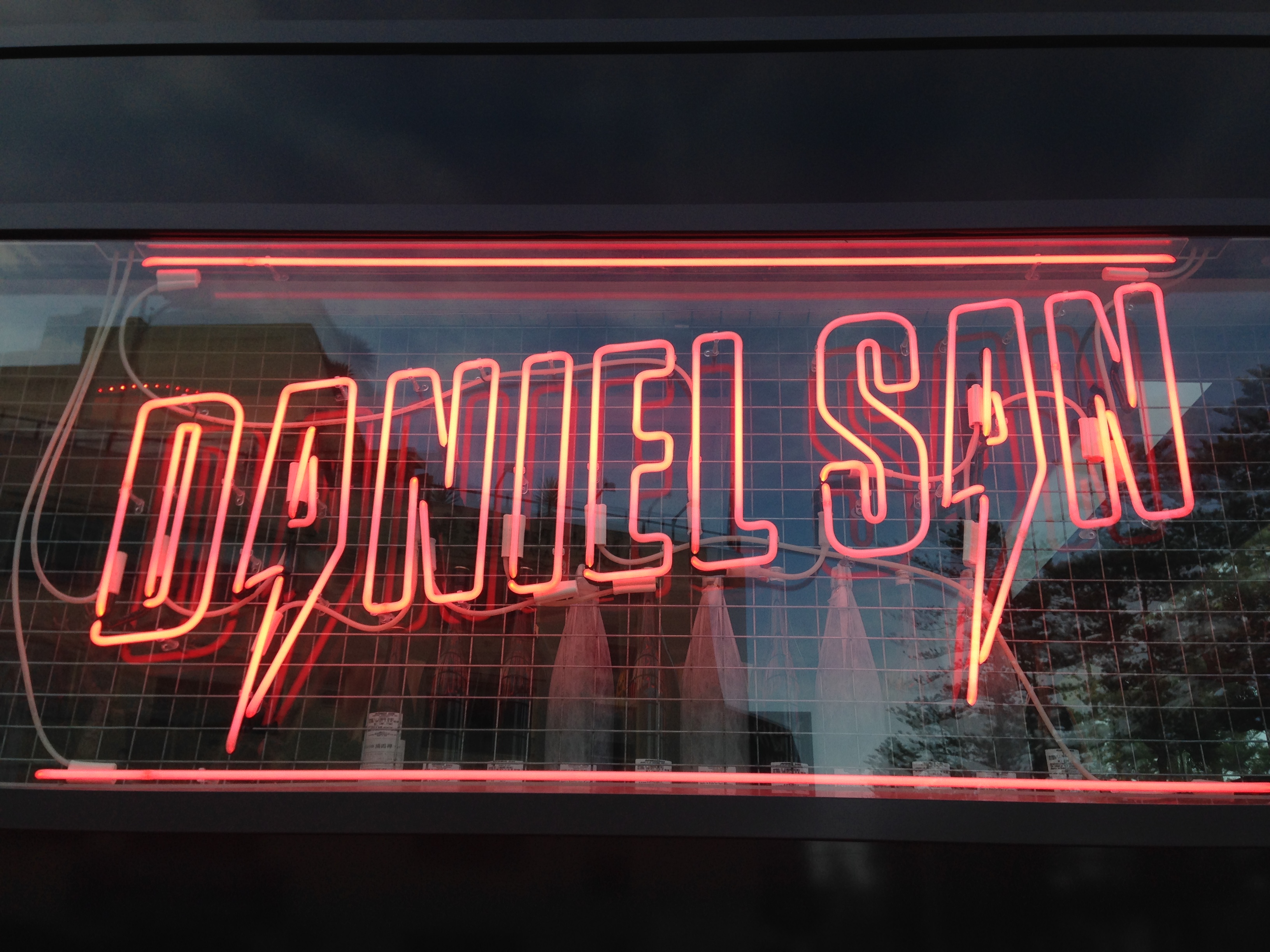 The wave of new places hitting the insular peninsula shows no signs of abating. The latest addition to Manly Beach’s burgeoning line-up of bars and restaurants is Daniel San, which is self described as a “Chow-down Bar & Beach-Side Dojo”. Daniel San is on the ground floor of what everyone knows as the Manly Pacific Hotel, which is on the corner of Raglan Street and North Steyne. Now I don’t think that Fraser Short (owner and Bar Baron) has a share in Frankie’s Pizza in Hunter Street – but Daniel San is kind of like Frankie’s with more natural light and a whole lot of Japanese thrown at you. There’s the pinnies, the rock’n’roll wallpaper, the music and the pricey beer – but there are plenty of unique aspects as well.