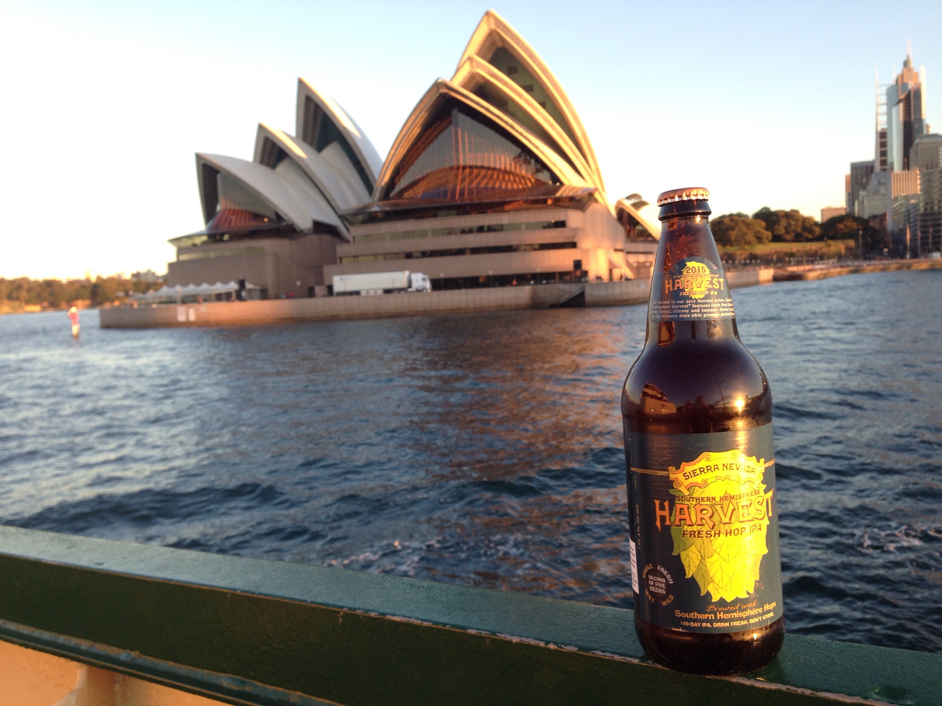 Thanks to our friends at the Australian Wine Centre, we’ve been able to get our hands on a bottle of Sierra Nevada’s Southern Hemisphere Harvest Fresh Hop IPA (2015) edition. Nothing from Oz has been close to this beer. Photographing it in front of the Sydney Opera House could regarded similarly to Australia claiming Crowded House, but in the interests of full disclosure the hops are from New Zealand. Fresh is best as they say and I obeying Sierra Nevada’s instructions by drinking this soon as I can.