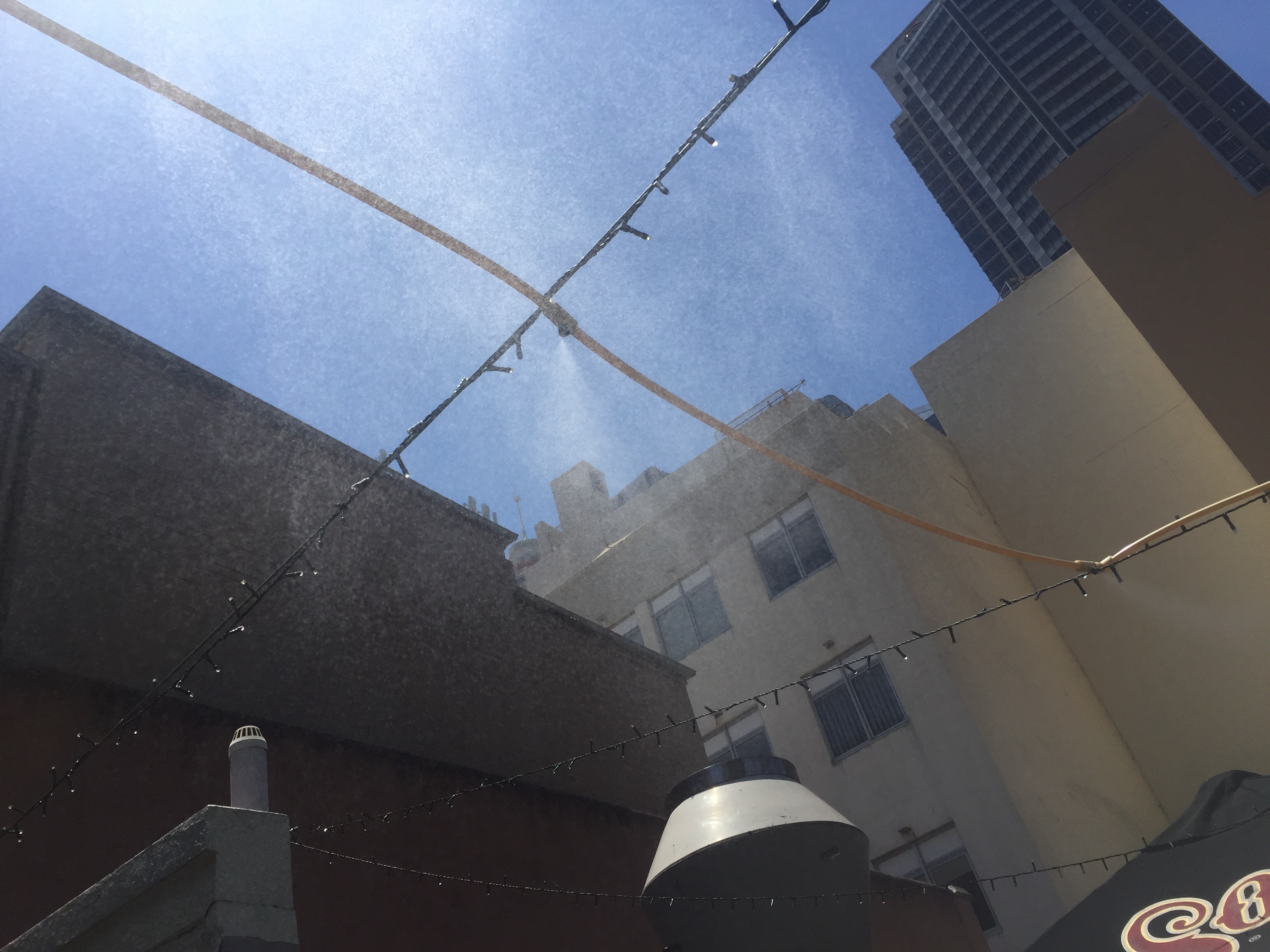 It’s brutally hot in Sydney (it’s looking a summer of extremes). Even with its umbrellas, the rooftop might have just been too hot. No problems for Sweeney’s, however. They’ve installed a water mist system, that pumps a fine spray of H2O in the air that manages to cool without really wetting you. Sheer brilliance and an inspiration for my own deck(s). All they need is a dumb waiter to bring up the food from the bistro and perfection would be just about achieved.
