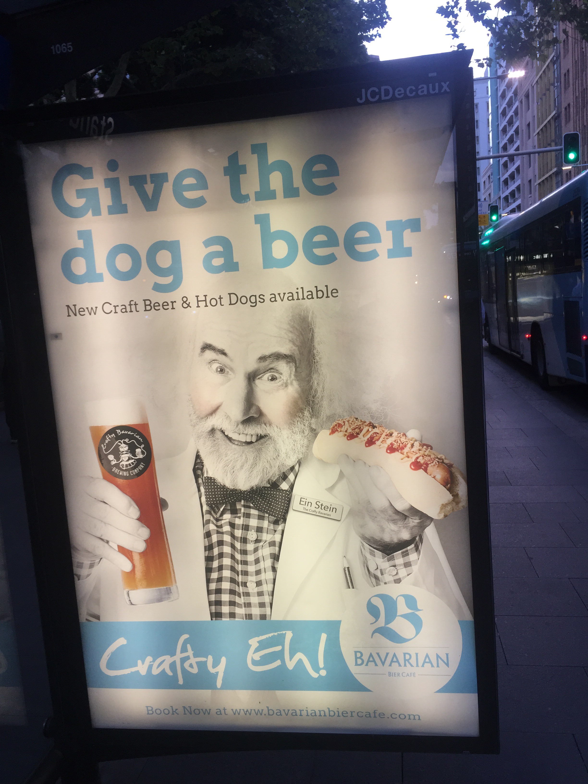 If you get off the bus at Wynyard you can’t but notice some coin being dropped by the Bavarian Beer Cafe on bus shelter advertising. Unlike much of their previous advertising, there’s no cleavage in sight. Bavarian’s gone craft beer on us, and some fair priced lunch specials as well. I do like the burgers.